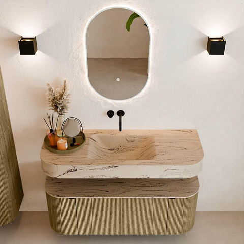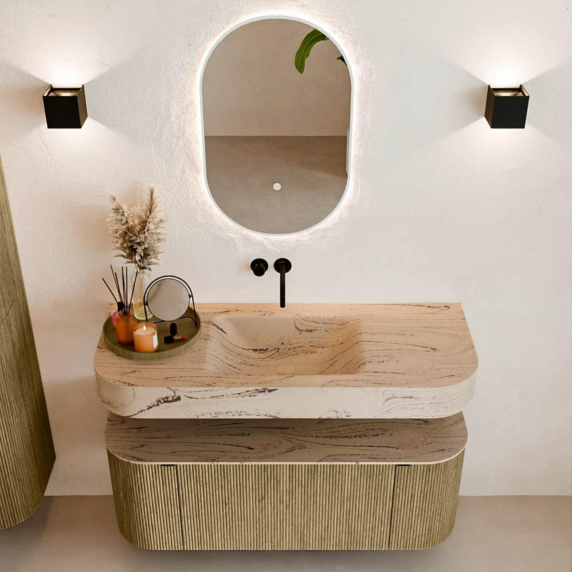 Natuurlijke materialen in warme tinten. De verticale ribbels brengen ritme en textuur in het ontwerp, terwijl het eikenhout zorgt voor een warme, ambachtelijke uitstraling. Kies uit 5 houttinten OAK, WALNUT, DUSK, SHADOW en RUBY zorgvuldig geselecteerde houtkleuren om zowel moderne als klassieke badkamers te verrijken.