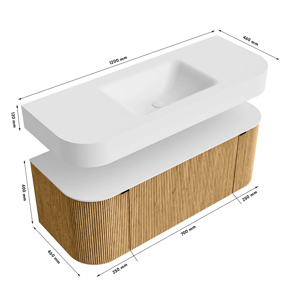 Boven het meubel zweeft een bijpassende, vrij hangende wastafel met afgeronde hoeken – perfect afgestemd op de vorm van de kast. De wastafel is uitgevoerd in Solid Surface en volgt subtiel de lijnen van het onderliggende meubel, waardoor een harmonieus geheel ontstaat. Het Solid Surface topblad vormt een sterke, onderhoudsvriendelijke basis en maakt de combinatie compleet.
