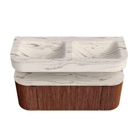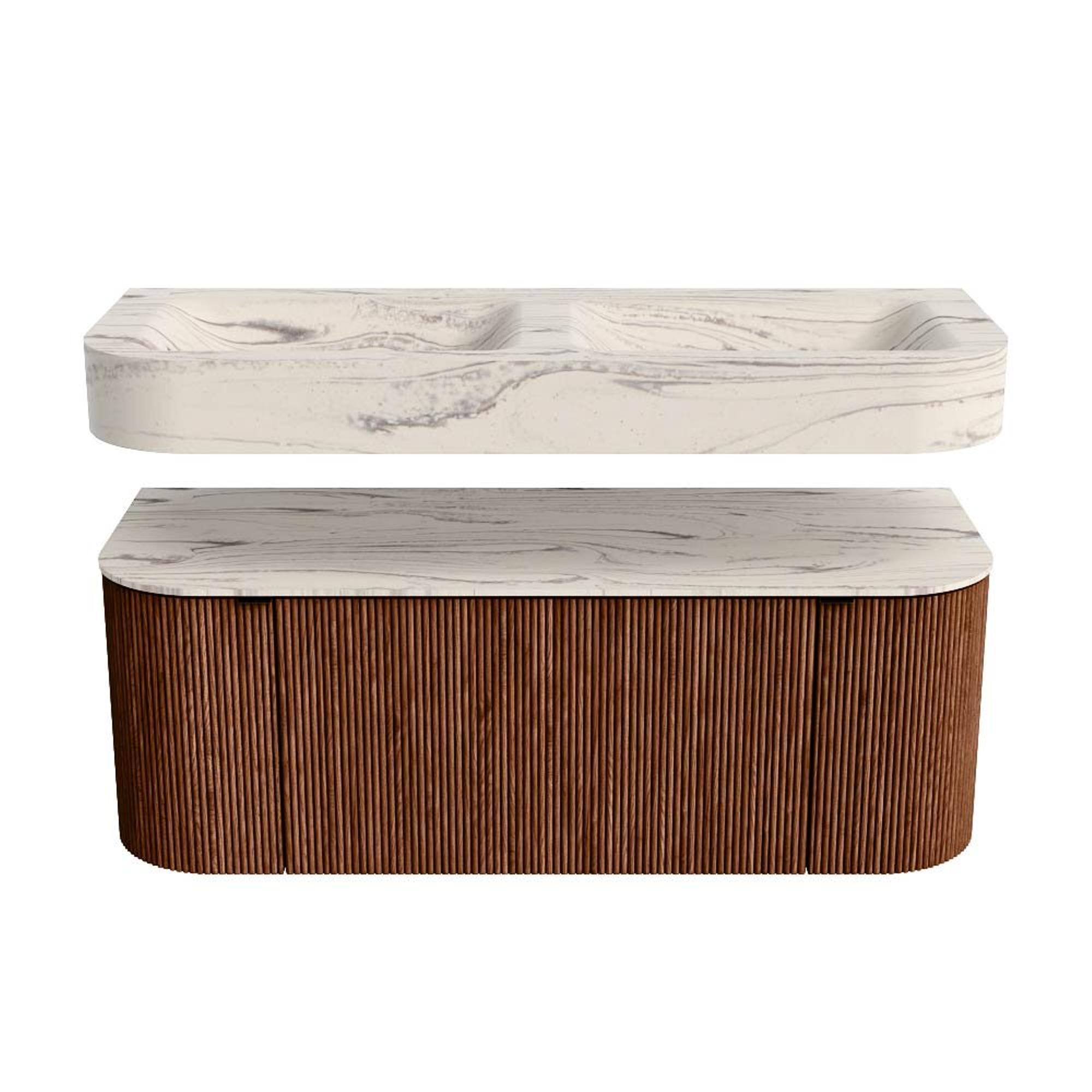 MONDIAZ THOR-DLUX 120cm badmeubel ronding links + rechts kleur Ruby met 1 lade en 2 deuren. Vrijhangende wastafel CLOUD Dubbel 2 kraangaten kleur Nata.