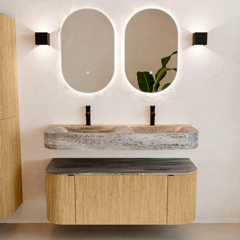 Natuurlijke materialen in warme tinten. De verticale ribbels brengen ritme en textuur in het ontwerp, terwijl het eikenhout zorgt voor een warme, ambachtelijke uitstraling. Kies uit 5 houttinten OAK, WALNUT, DUSK, SHADOW en RUBY zorgvuldig geselecteerde houtkleuren om zowel moderne als klassieke badkamers te verrijken.