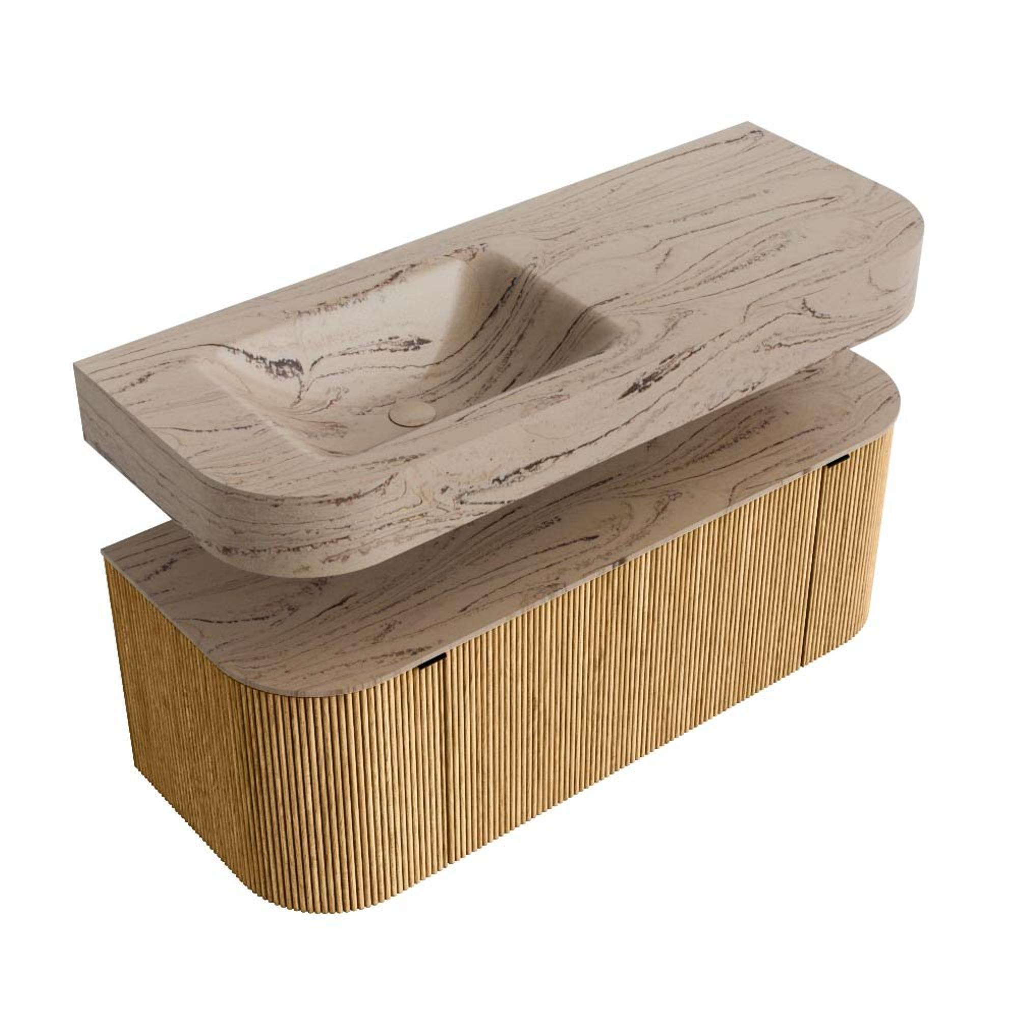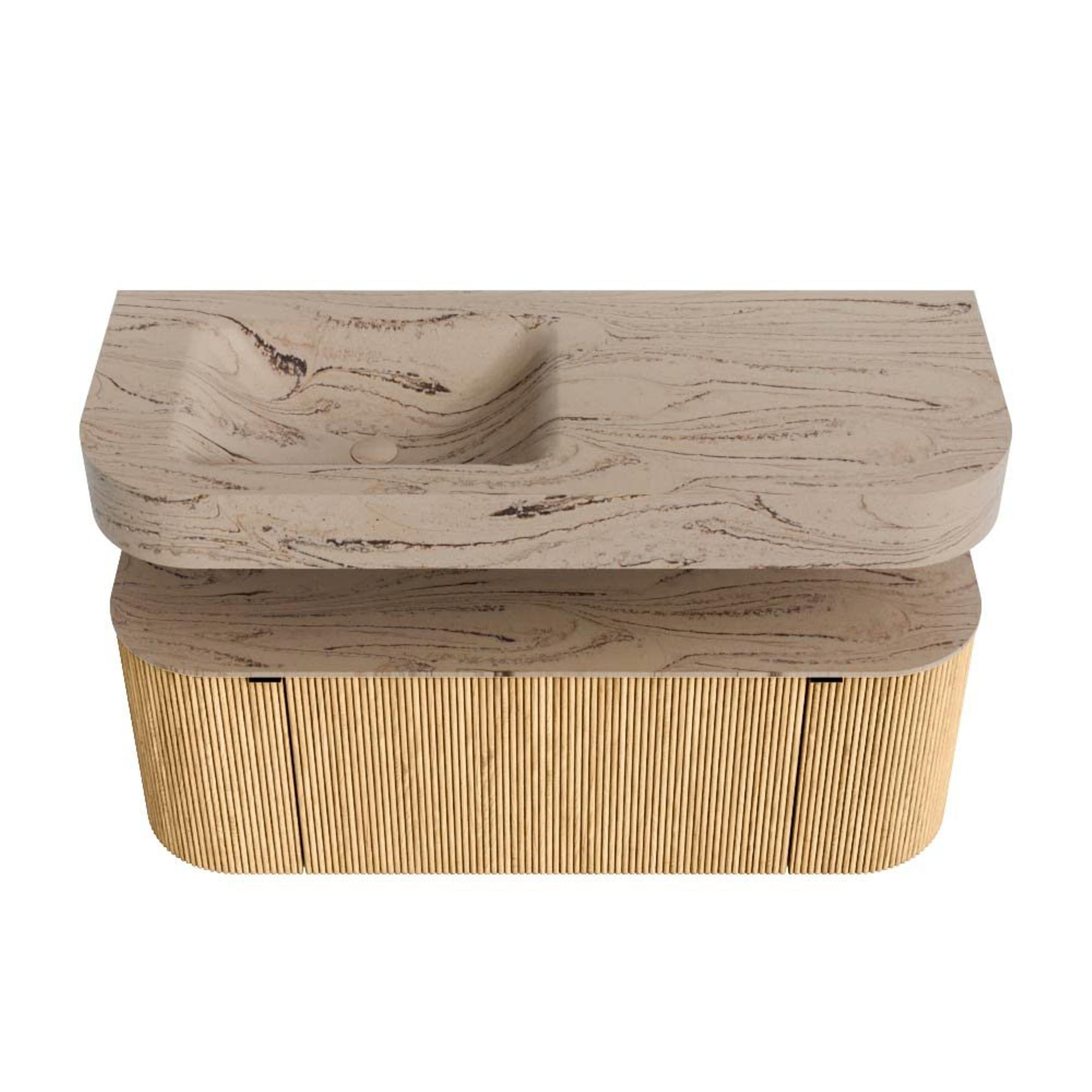 MONDIAZ THOR-DLUX 120cm badmeubel ronding links + rechts kleur Oak met 1 lade en 2 deuren. Vrijhangende wastafel CLOUD Links 1 kraangat kleur Arena.