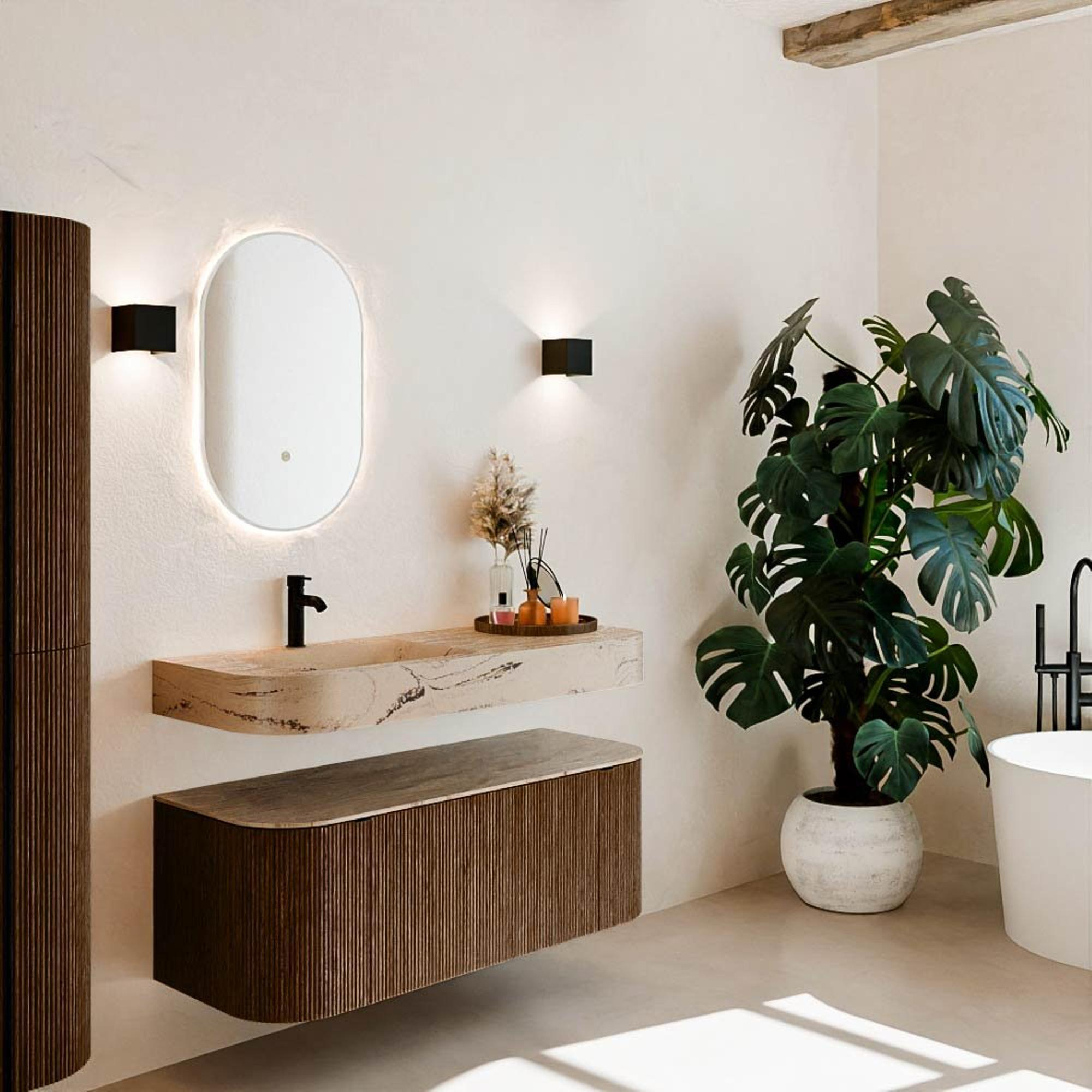 Natuurlijke materialen in warme tinten. De verticale ribbels brengen ritme en textuur in het ontwerp, terwijl het eikenhout zorgt voor een warme, ambachtelijke uitstraling. Kies uit 5 houttinten OAK, WALNUT, DUSK, SHADOW en RUBY zorgvuldig geselecteerde houtkleuren om zowel moderne als klassieke badkamers te verrijken.
