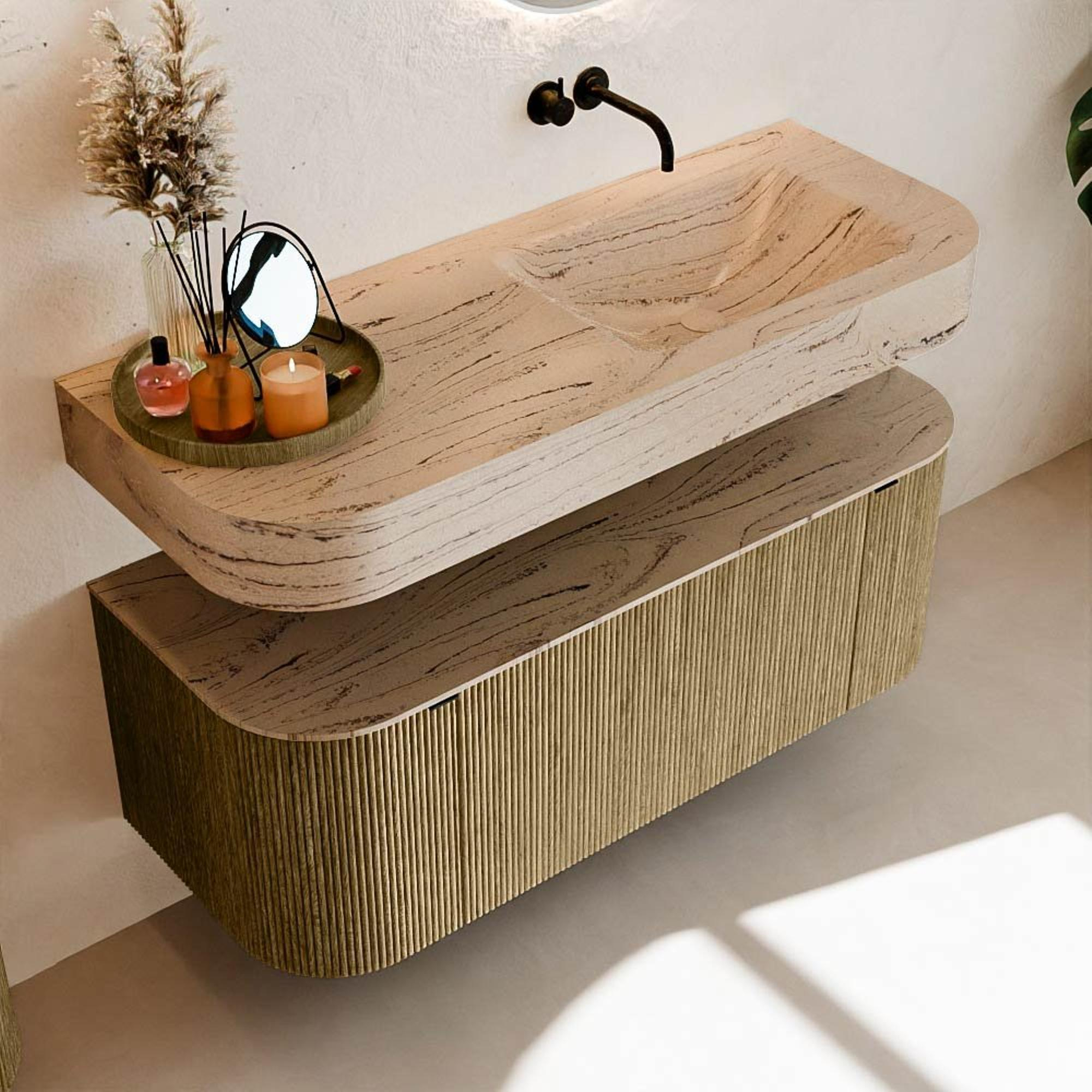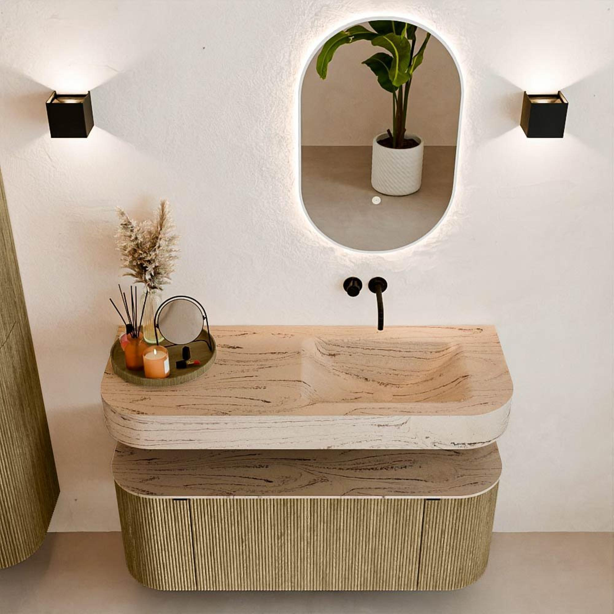 Natuurlijke materialen in warme tinten. De verticale ribbels brengen ritme en textuur in het ontwerp, terwijl het eikenhout zorgt voor een warme, ambachtelijke uitstraling. Kies uit 5 houttinten OAK, WALNUT, DUSK, SHADOW en RUBY zorgvuldig geselecteerde houtkleuren om zowel moderne als klassieke badkamers te verrijken.