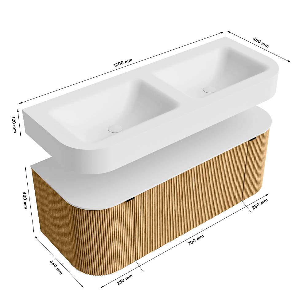 Boven het meubel zweeft een bijpassende, vrij hangende wastafel met afgeronde hoeken – perfect afgestemd op de vorm van de kast. De wastafel is uitgevoerd in Solid Surface en volgt subtiel de lijnen van het onderliggende meubel, waardoor een harmonieus geheel ontstaat. Het Solid Surface topblad vormt een sterke, onderhoudsvriendelijke basis en maakt de combinatie compleet.