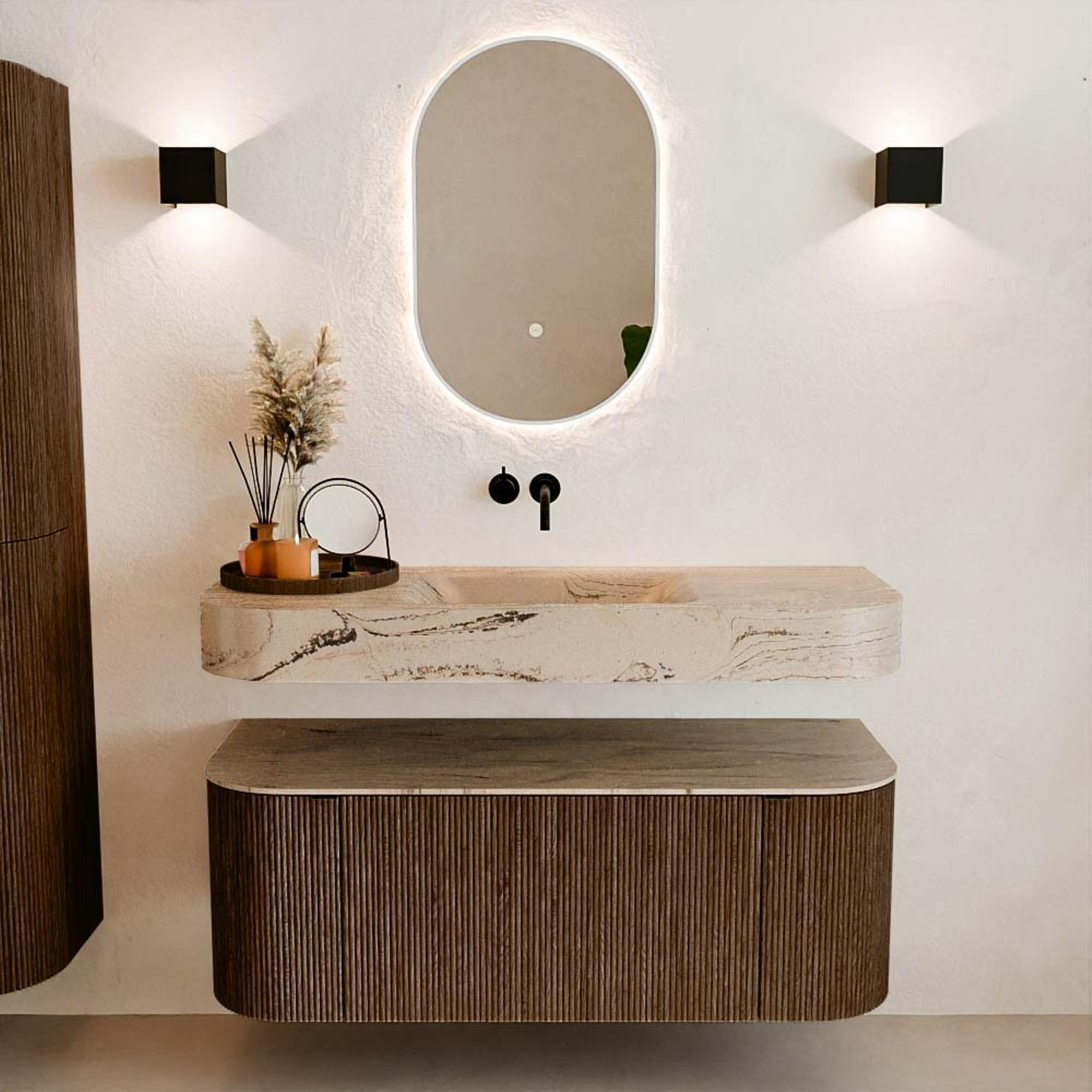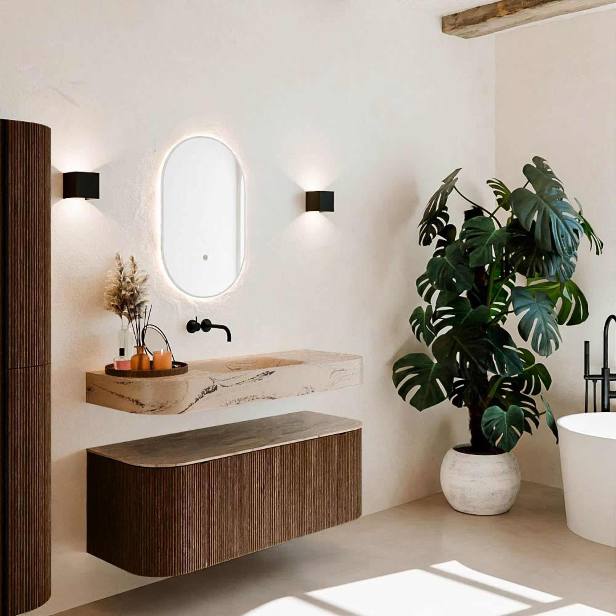 Natuurlijke materialen in warme tinten. De verticale ribbels brengen ritme en textuur in het ontwerp, terwijl het eikenhout zorgt voor een warme, ambachtelijke uitstraling. Kies uit 5 houttinten OAK, WALNUT, DUSK, SHADOW en RUBY zorgvuldig geselecteerde houtkleuren om zowel moderne als klassieke badkamers te verrijken.