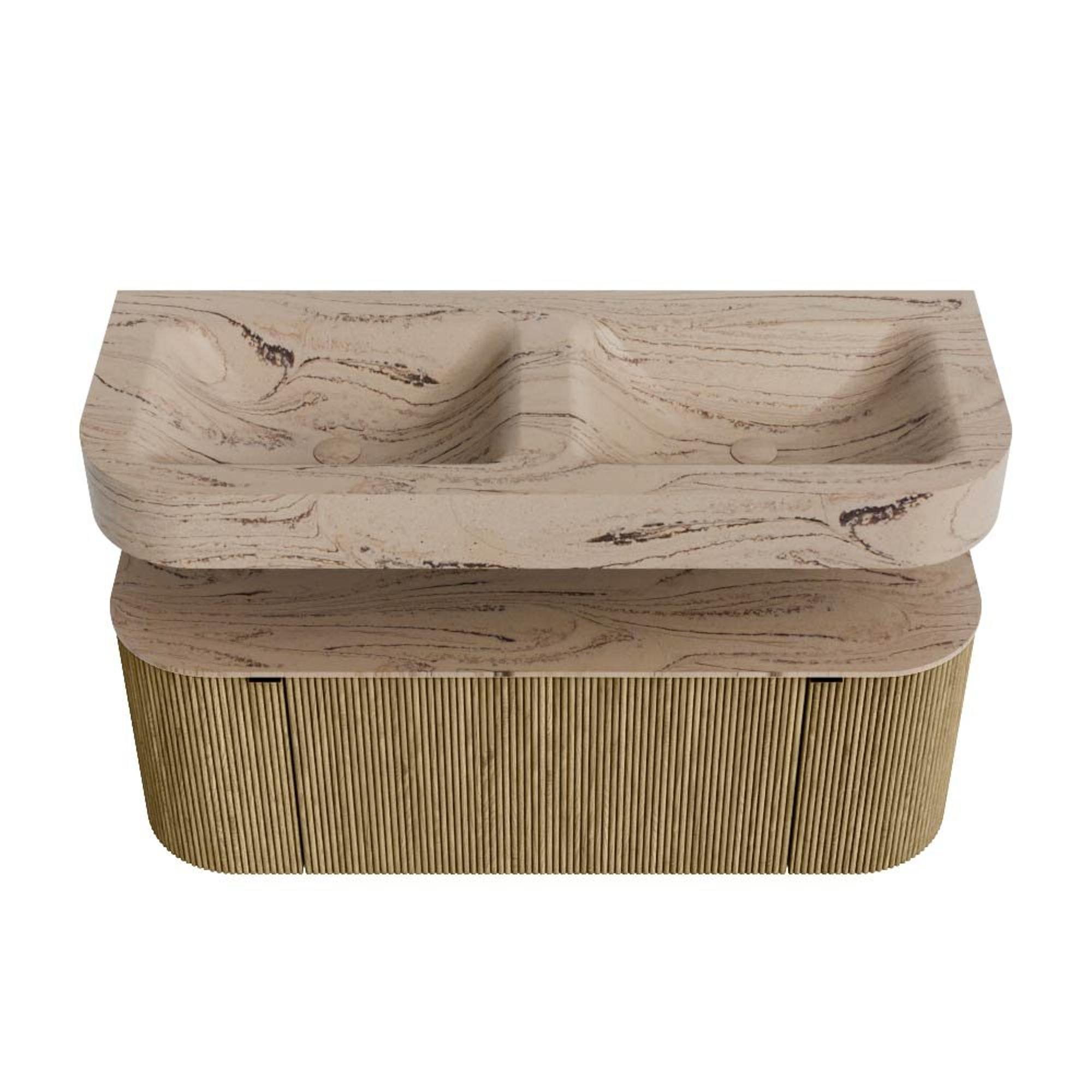 MONDIAZ THOR-DLUX 120cm badmeubel ronding links + rechts kleur Dusk met 1 lade en 2 deuren. Vrijhangende wastafel CLOUD Dubbel zonder kraangat kleur Arena.