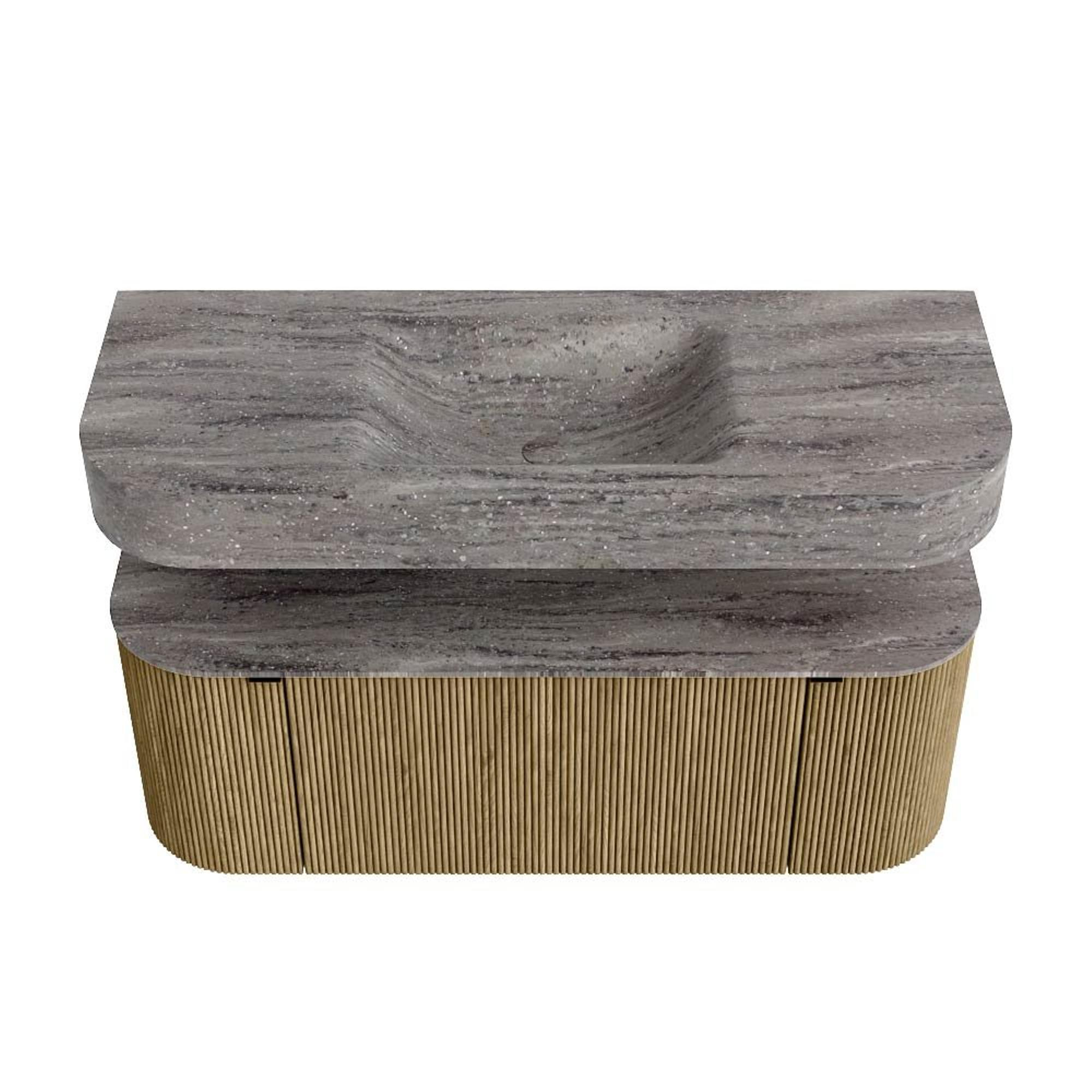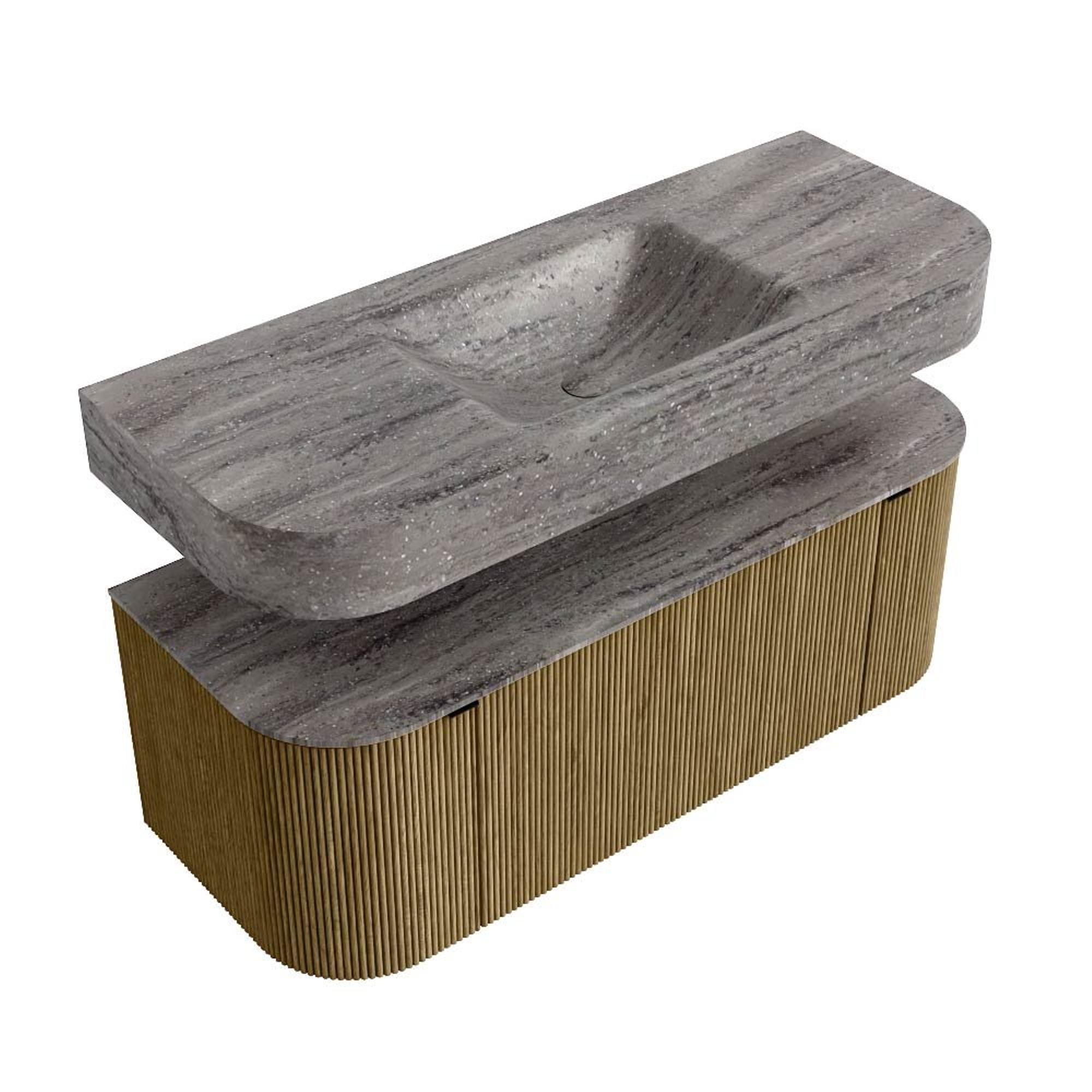 MONDIAZ THOR-DLUX 120cm badmeubel ronding links + rechts kleur Dusk met 1 lade en 2 deuren. Vrijhangende wastafel CLOUD Midden zonder kraangat kleur Oza.