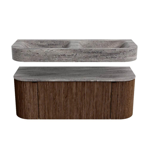 MONDIAZ THOR-DLUX 120cm badmeubel ronding links + rechts kleur Walnut met 1 lade en 2 deuren. Vrijhangende wastafel CLOUD Dubbel zonder kraangat kleur Oza.