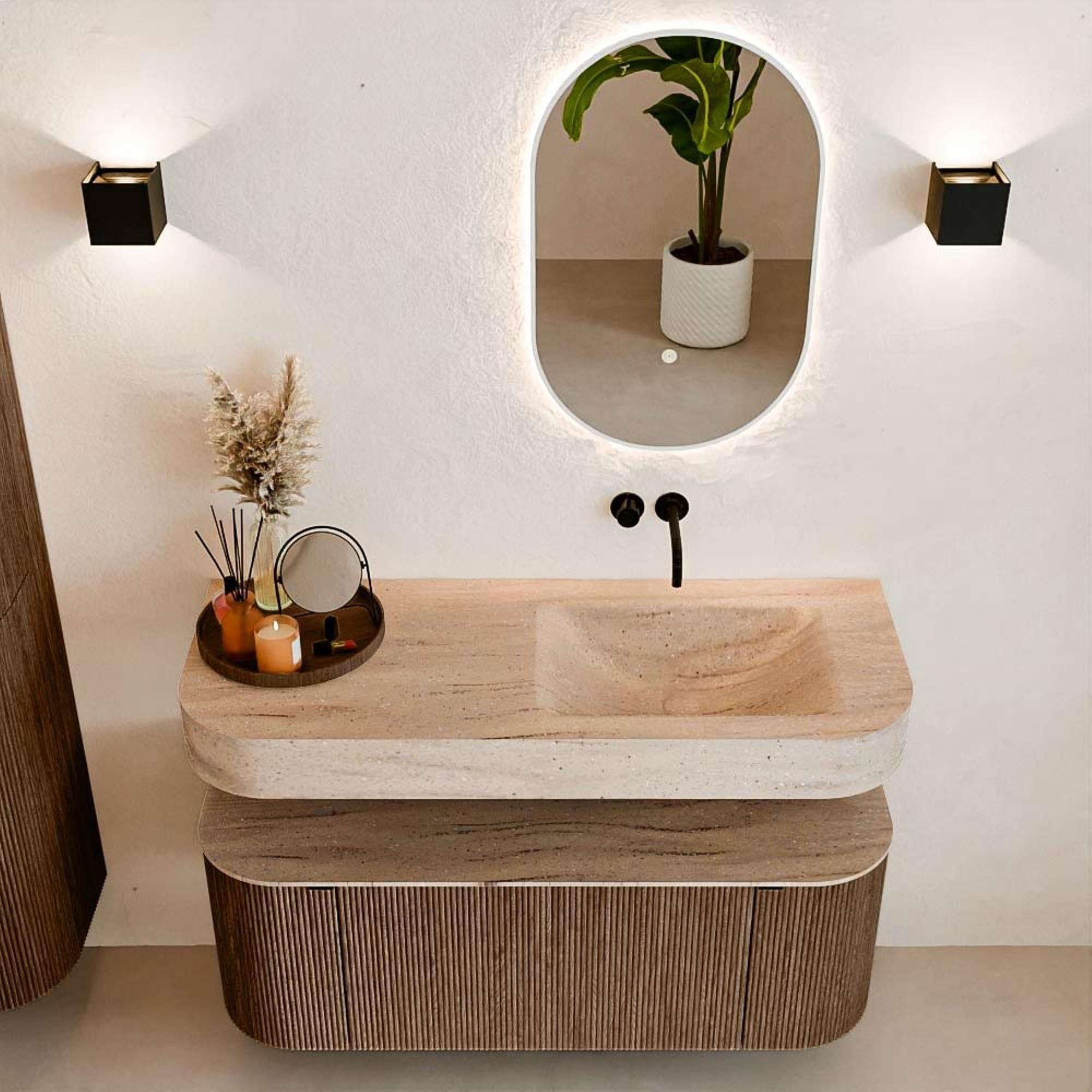 Natuurlijke materialen in warme tinten. De verticale ribbels brengen ritme en textuur in het ontwerp, terwijl het eikenhout zorgt voor een warme, ambachtelijke uitstraling. Kies uit 5 houttinten OAK, WALNUT, DUSK, SHADOW en RUBY zorgvuldig geselecteerde houtkleuren om zowel moderne als klassieke badkamers te verrijken.