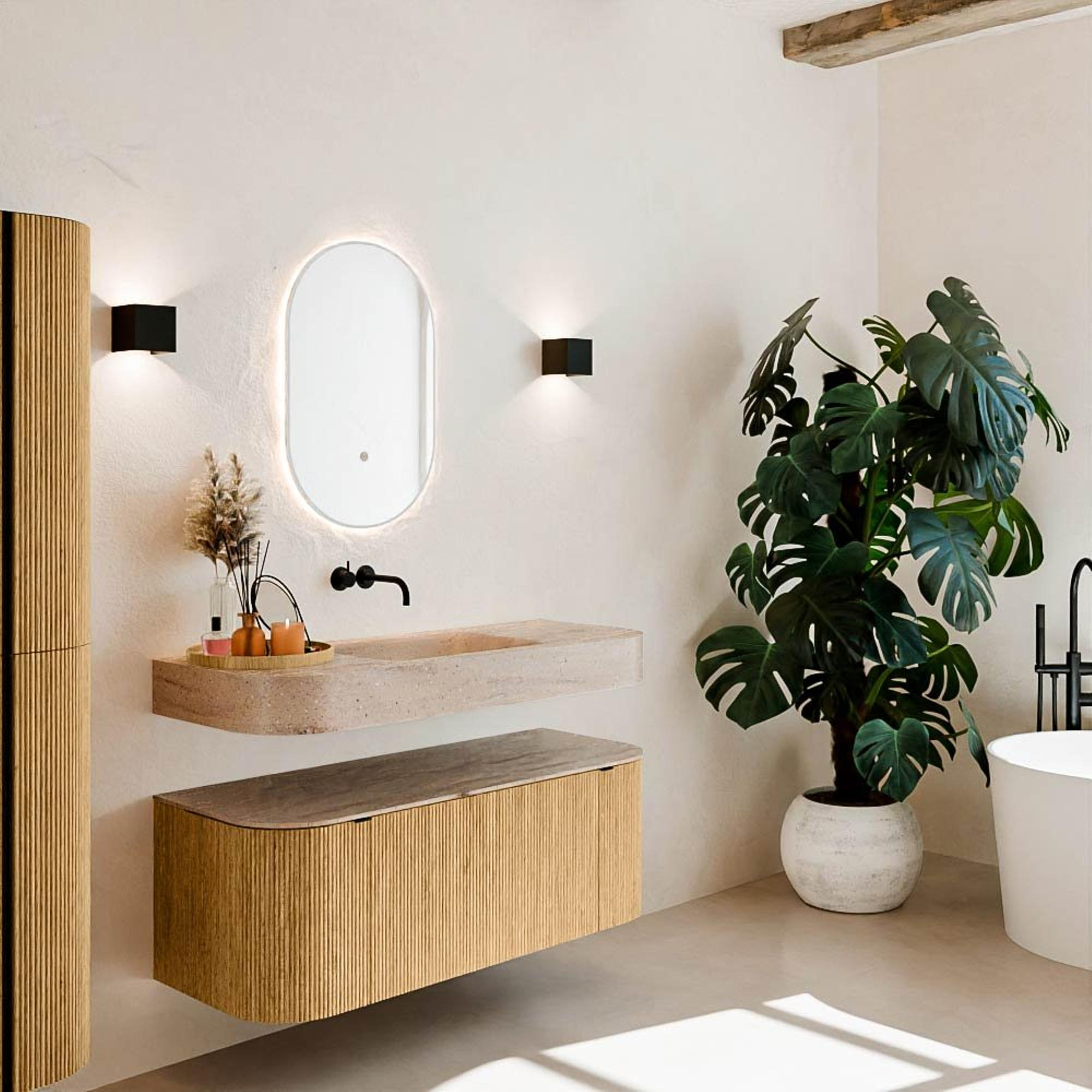 Natuurlijke materialen in warme tinten. De verticale ribbels brengen ritme en textuur in het ontwerp, terwijl het eikenhout zorgt voor een warme, ambachtelijke uitstraling. Kies uit 5 houttinten OAK, WALNUT, DUSK, SHADOW en RUBY zorgvuldig geselecteerde houtkleuren om zowel moderne als klassieke badkamers te verrijken.