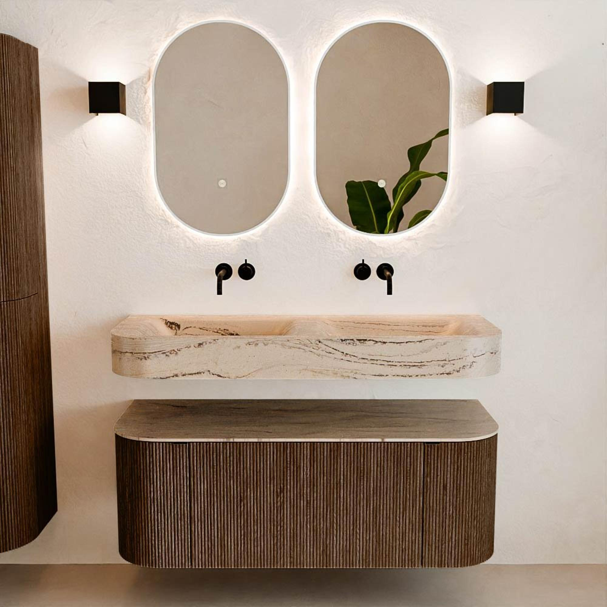 Natuurlijke materialen in warme tinten. De verticale ribbels brengen ritme en textuur in het ontwerp, terwijl het eikenhout zorgt voor een warme, ambachtelijke uitstraling. Kies uit 5 houttinten OAK, WALNUT, DUSK, SHADOW en RUBY zorgvuldig geselecteerde houtkleuren om zowel moderne als klassieke badkamers te verrijken.