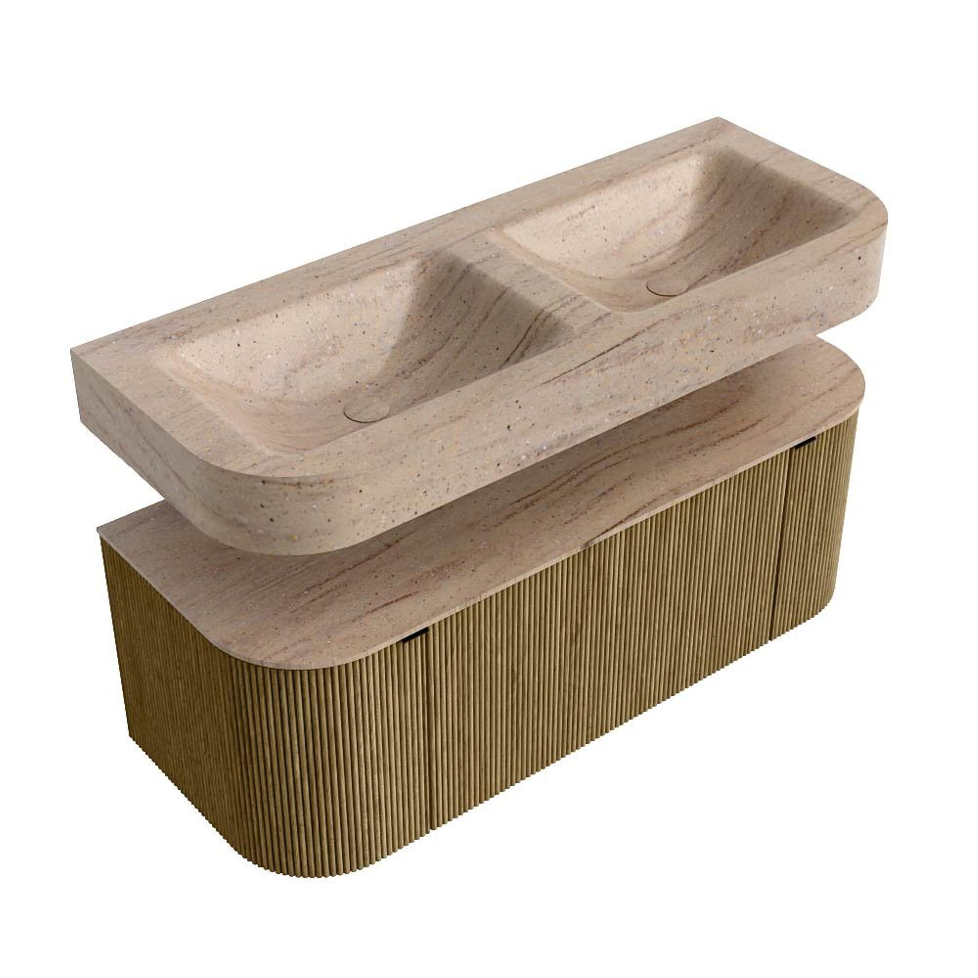 MONDIAZ THOR-DLUX 120cm badmeubel ronding links + rechts kleur Dusk met 1 lade en 2 deuren. Vrijhangende wastafel CLOUD Dubbel zonder kraangat kleur Saba.