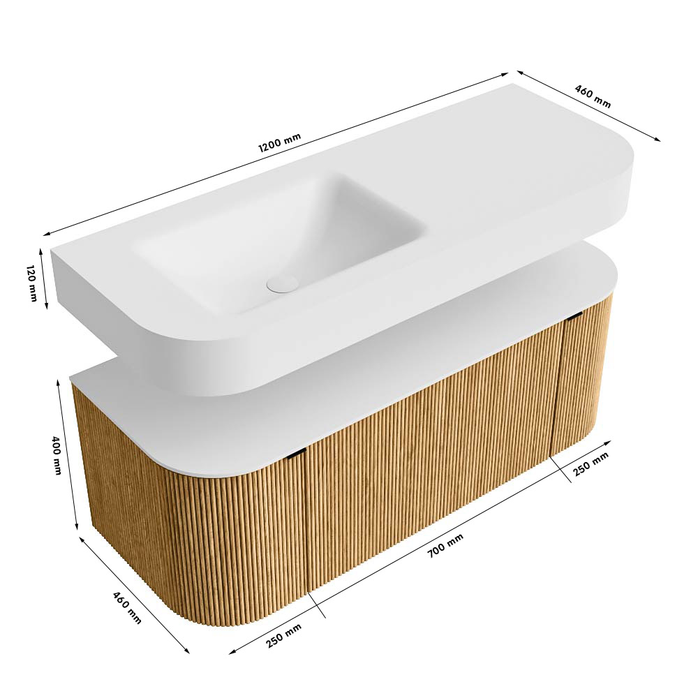 Boven het meubel zweeft een bijpassende, vrij hangende wastafel met afgeronde hoeken – perfect afgestemd op de vorm van de kast. De wastafel is uitgevoerd in Solid Surface en volgt subtiel de lijnen van het onderliggende meubel, waardoor een harmonieus geheel ontstaat. Het Solid Surface topblad vormt een sterke, onderhoudsvriendelijke basis en maakt de combinatie compleet.