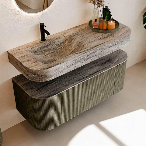MONDIAZ THOR-DLUX 120cm badmeubel ronding links + rechts kleur Shadow met 1 lade en 2 deuren. Vrijhangende wastafel CLOUD Links 1 kraangat kleur Oza.