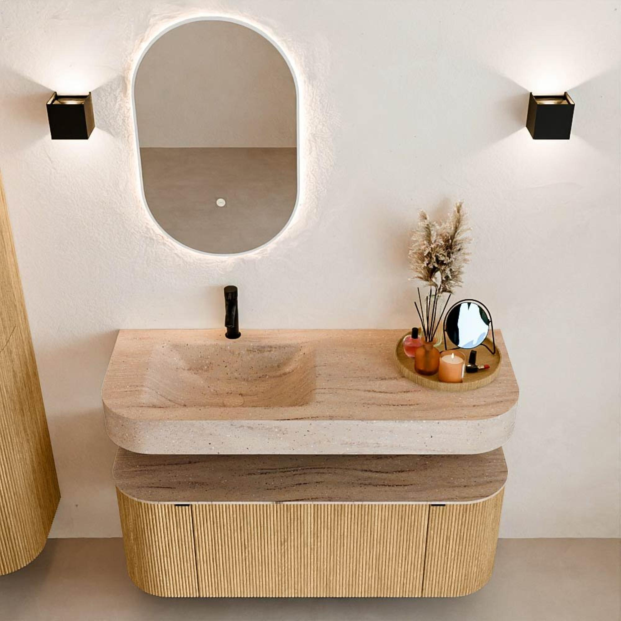 Natuurlijke materialen in warme tinten. De verticale ribbels brengen ritme en textuur in het ontwerp, terwijl het eikenhout zorgt voor een warme, ambachtelijke uitstraling. Kies uit 5 houttinten OAK, WALNUT, DUSK, SHADOW en RUBY zorgvuldig geselecteerde houtkleuren om zowel moderne als klassieke badkamers te verrijken.