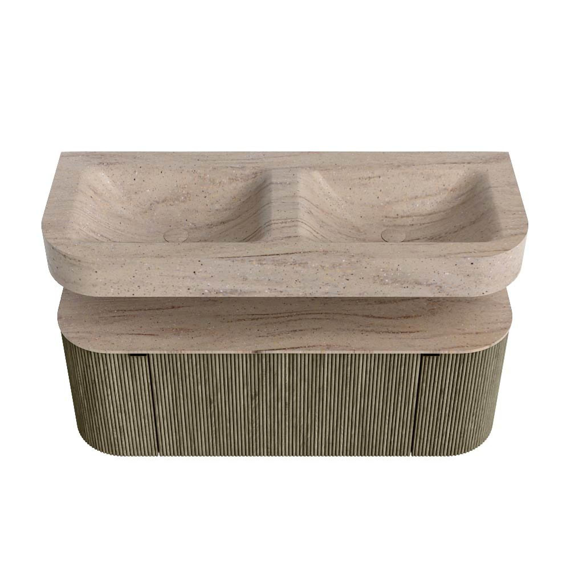 MONDIAZ THOR-DLUX 120cm badmeubel ronding links + rechts kleur Shadow met 1 lade en 2 deuren. Vrijhangende wastafel CLOUD Dubbel zonder kraangat kleur Saba.