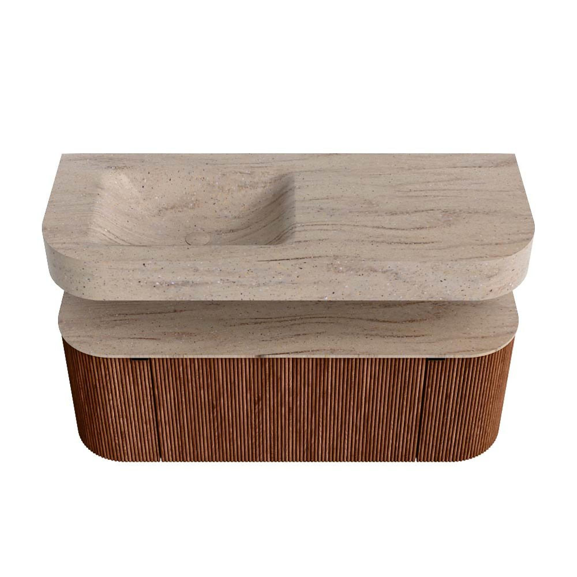 MONDIAZ THOR-DLUX 120cm badmeubel ronding links + rechts kleur Ruby met 1 lade en 2 deuren. Vrijhangende wastafel CLOUD Links 1 kraangat kleur Saba.