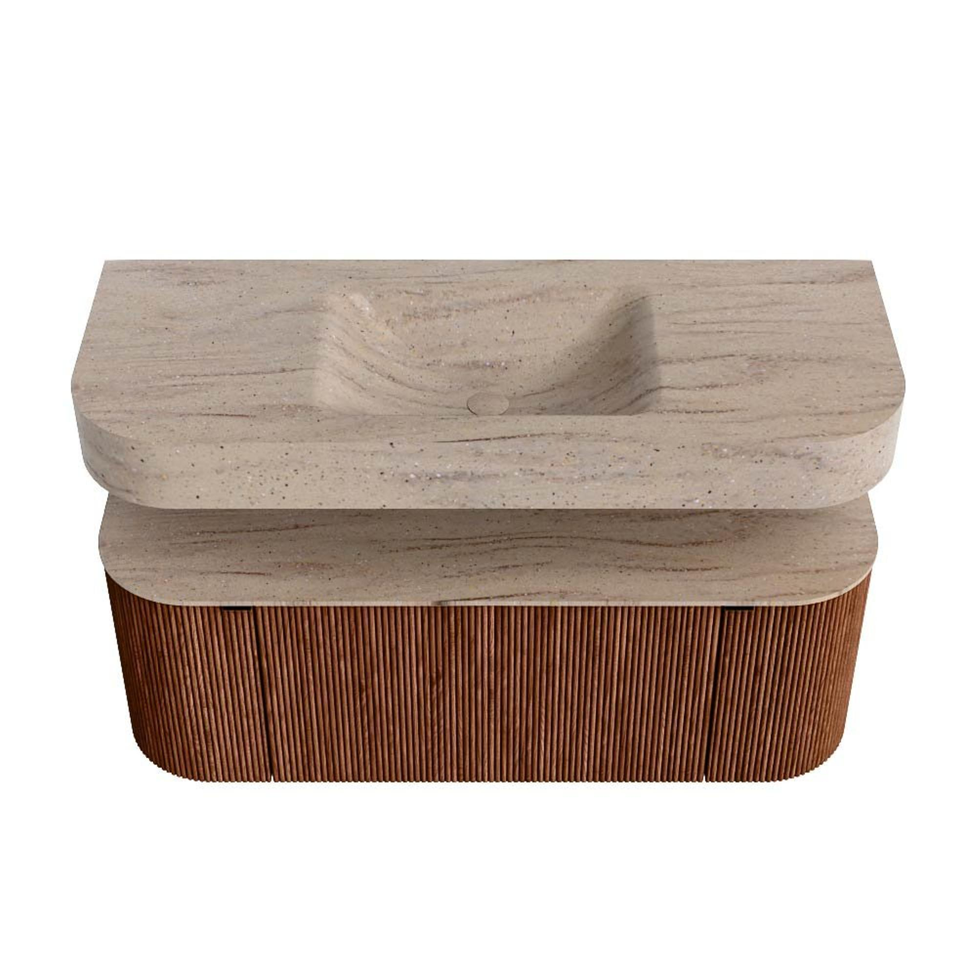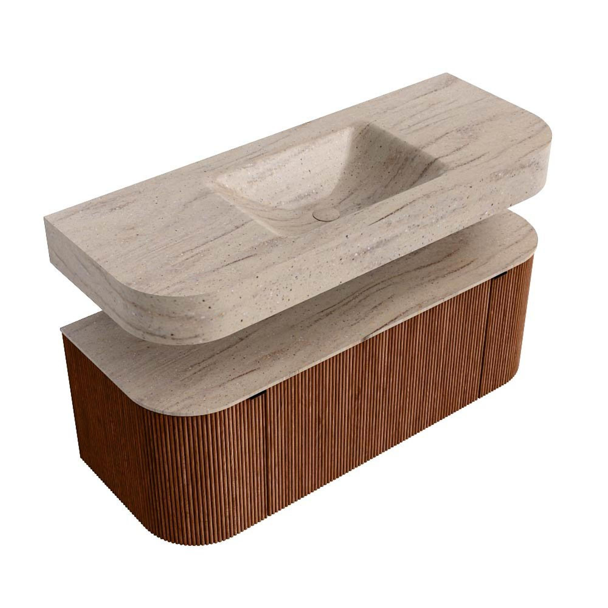 MONDIAZ THOR-DLUX 120cm badmeubel ronding links + rechts kleur Ruby met 1 lade en 2 deuren. Vrijhangende wastafel CLOUD Midden 1 kraangat kleur Saba.