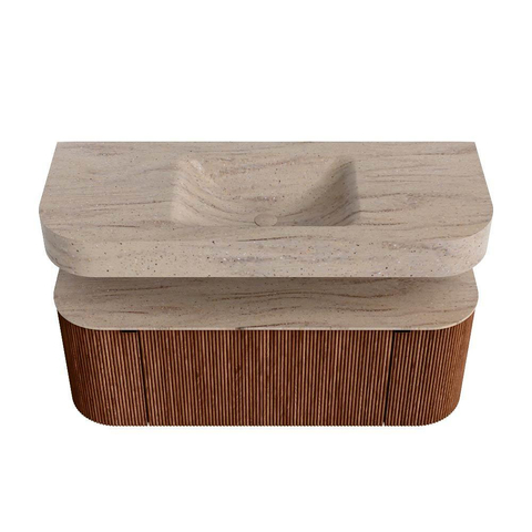 Boven het meubel zweeft een bijpassende, vrij hangende wastafel met afgeronde hoeken – perfect afgestemd op de vorm van de kast. De wastafel is uitgevoerd in Solid Surface en volgt subtiel de lijnen van het onderliggende meubel, waardoor een harmonieus geheel ontstaat. Het Solid Surface topblad vormt een sterke, onderhoudsvriendelijke basis en maakt de combinatie compleet.