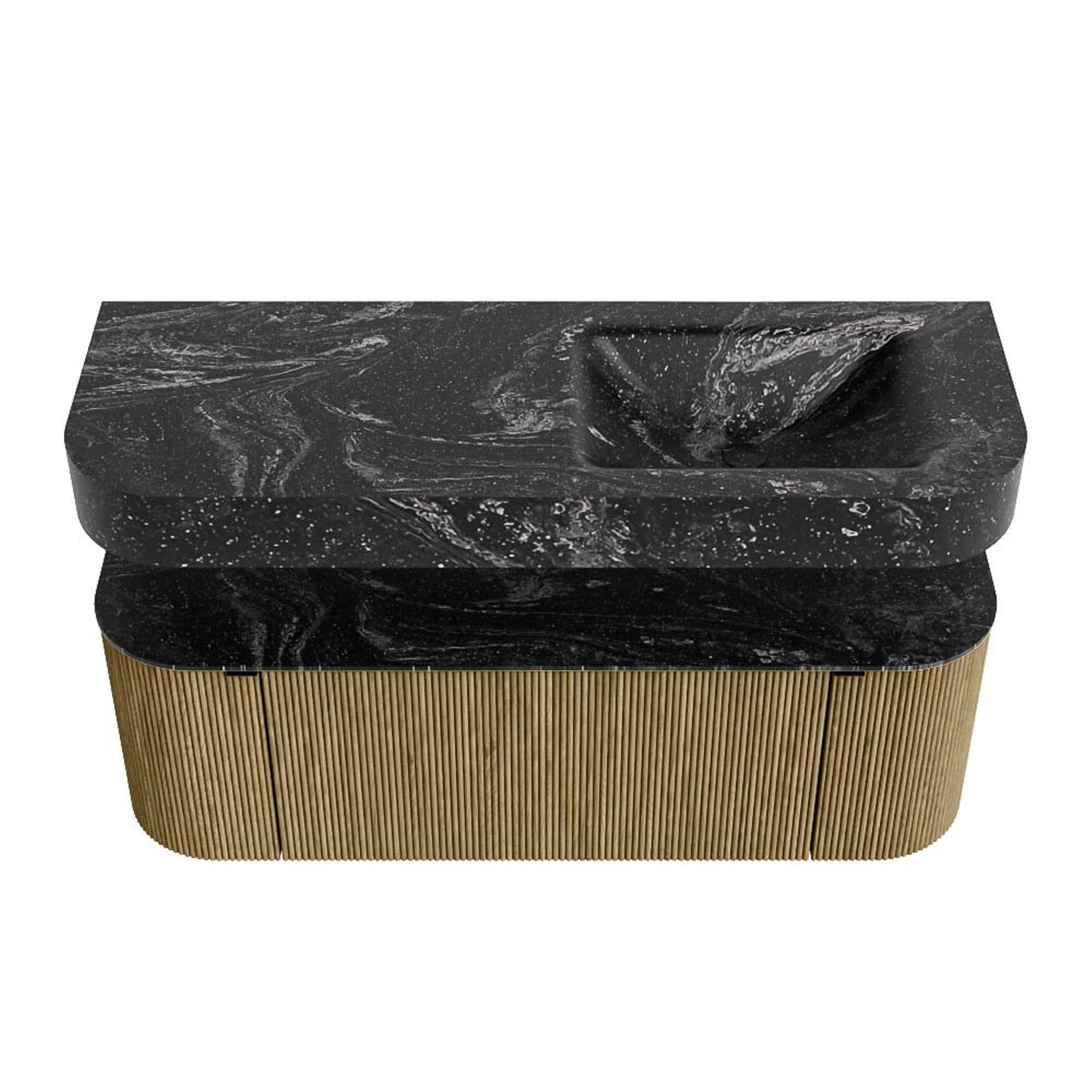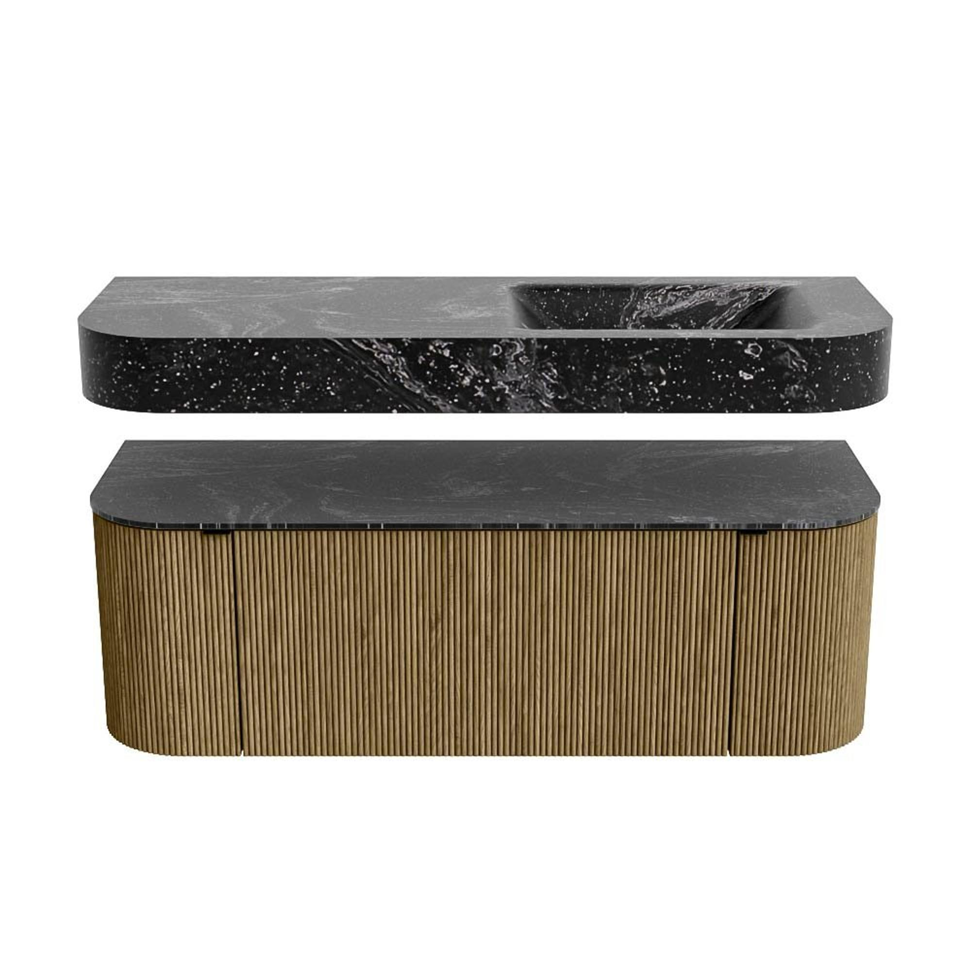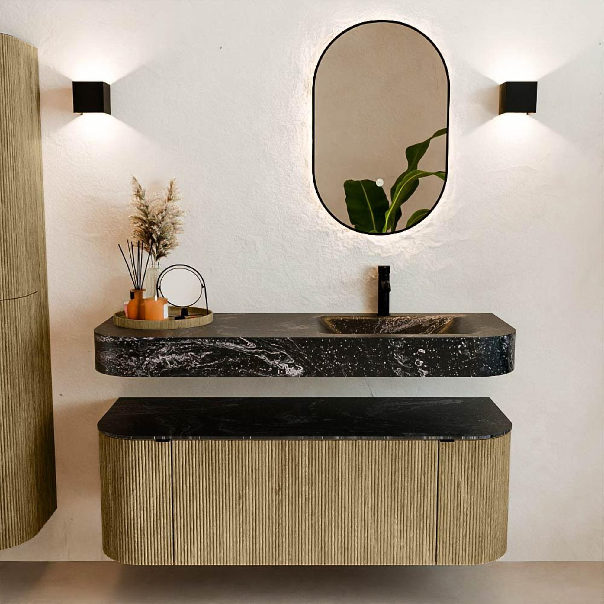 MONDIAZ THOR-DLUX 130cm badmeubel ronding links + rechts kleur Dusk met 1 lade en 2 deuren. Vrijhangende wastafel CLOUD Rechts 1 kraangat kleur Lava.
