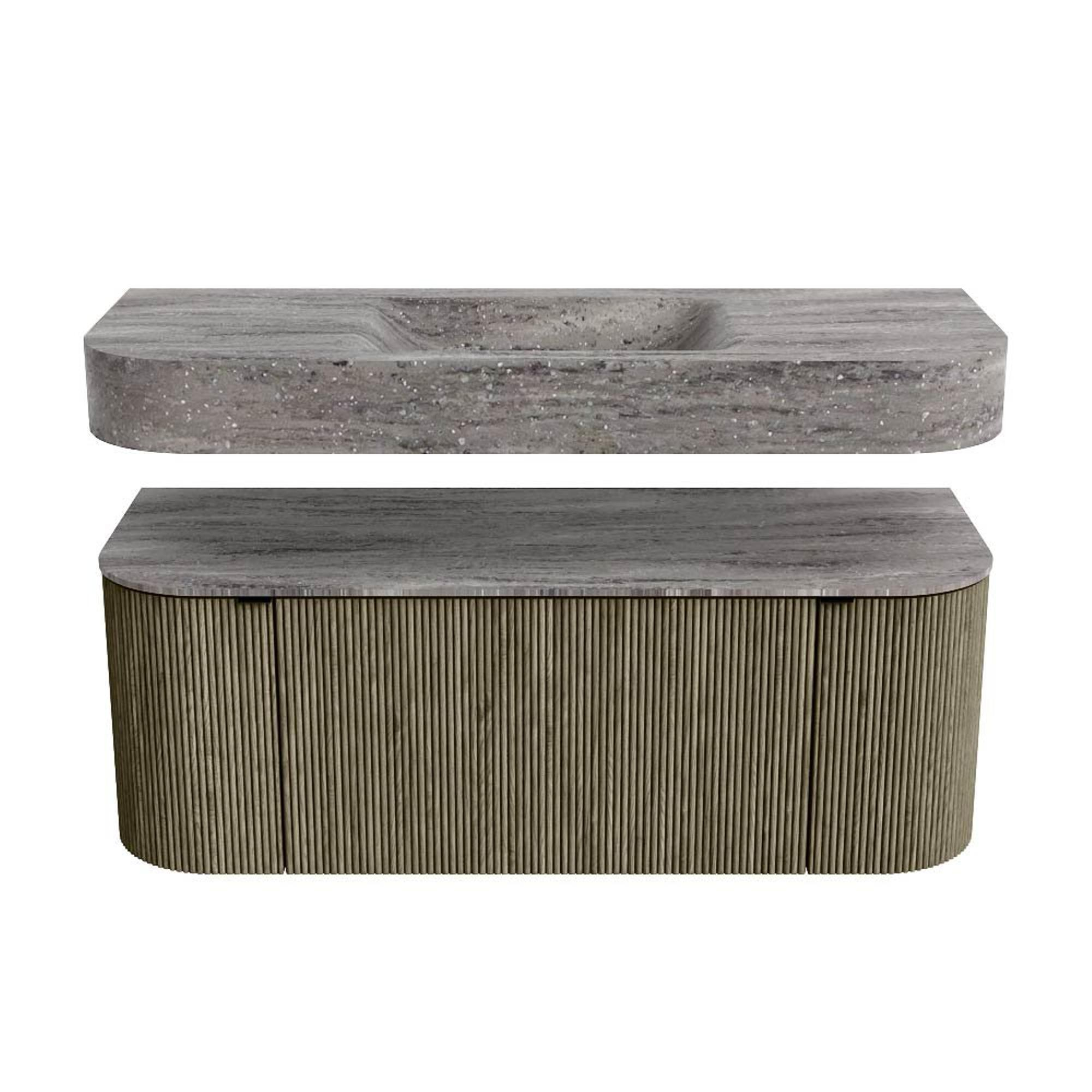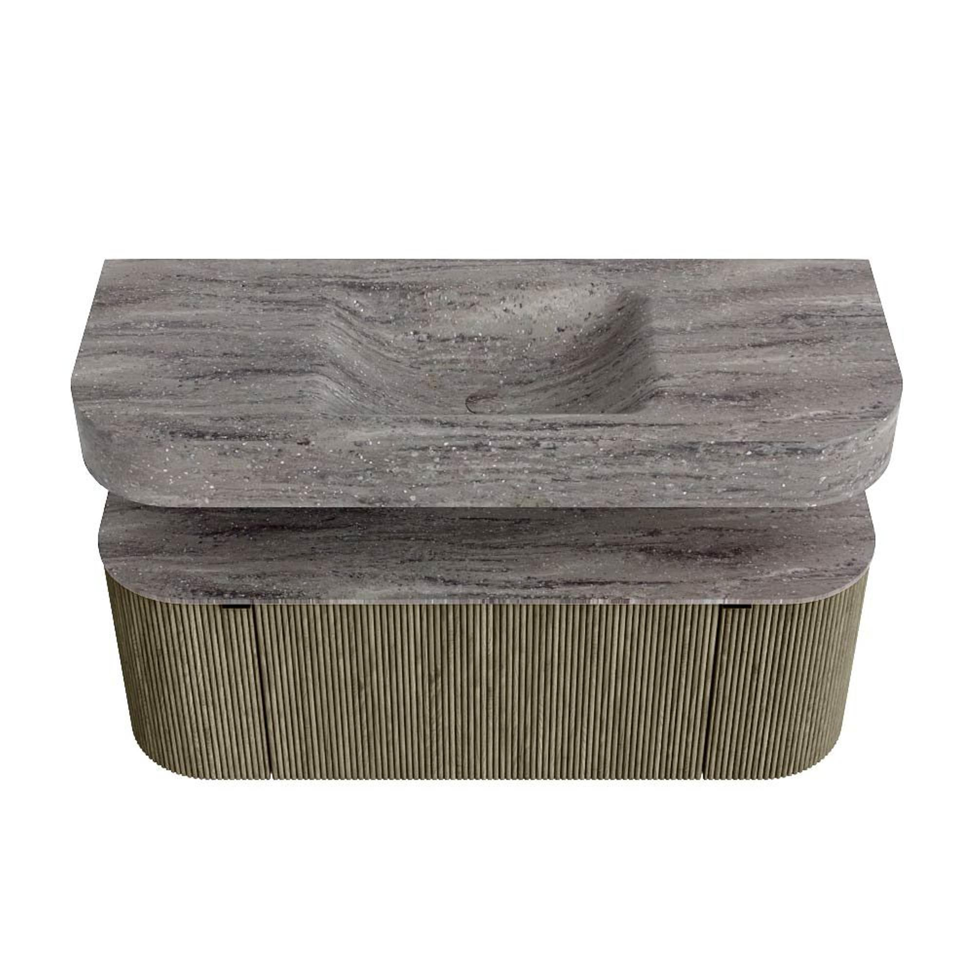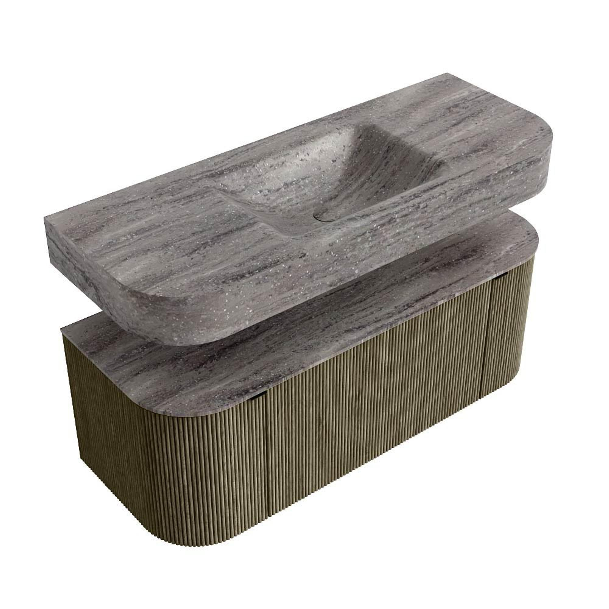 MONDIAZ THOR-DLUX 120cm badmeubel ronding links + rechts kleur Shadow met 1 lade en 2 deuren. Vrijhangende wastafel CLOUD Midden zonder kraangat kleur Oza.