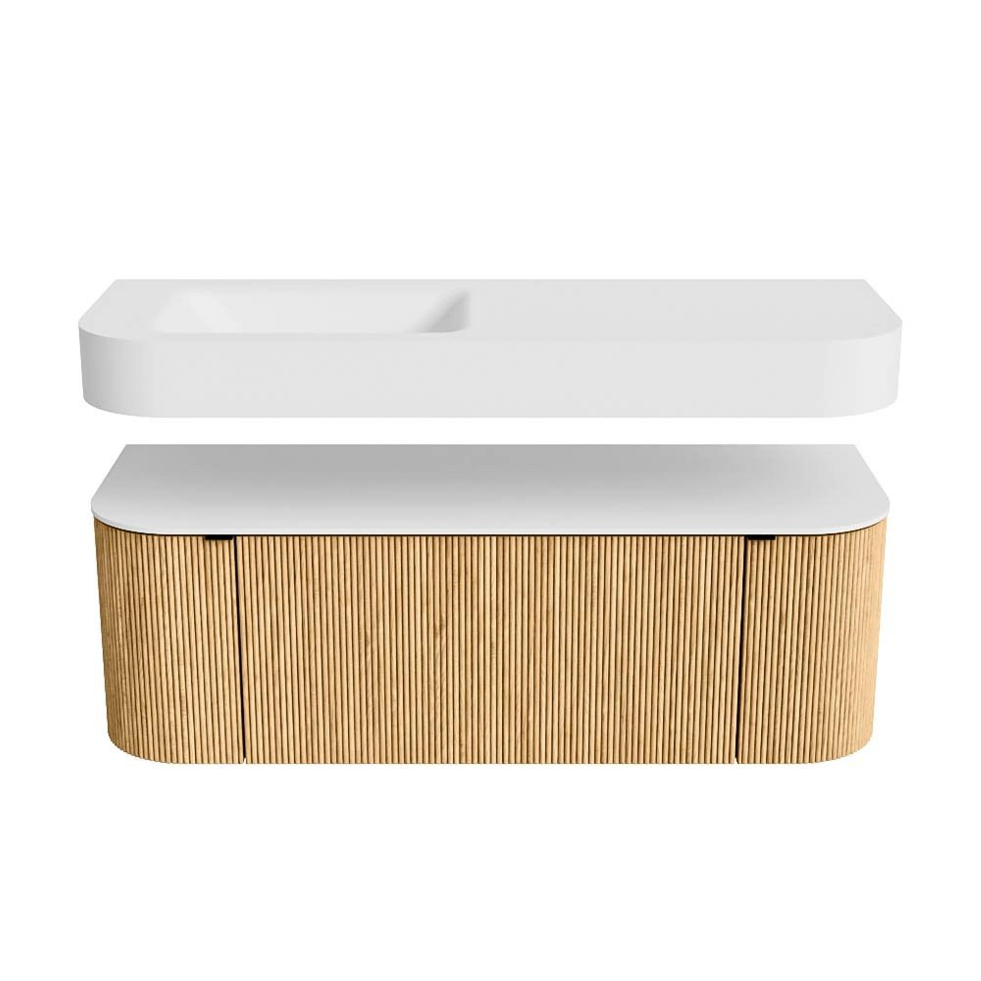 Boven het meubel zweeft een bijpassende, vrij hangende wastafel met afgeronde hoeken – perfect afgestemd op de vorm van de kast. De wastafel is uitgevoerd in Solid Surface en volgt subtiel de lijnen van het onderliggende meubel, waardoor een harmonieus geheel ontstaat. Het Solid Surface topblad vormt een sterke, onderhoudsvriendelijke basis en maakt de combinatie compleet.