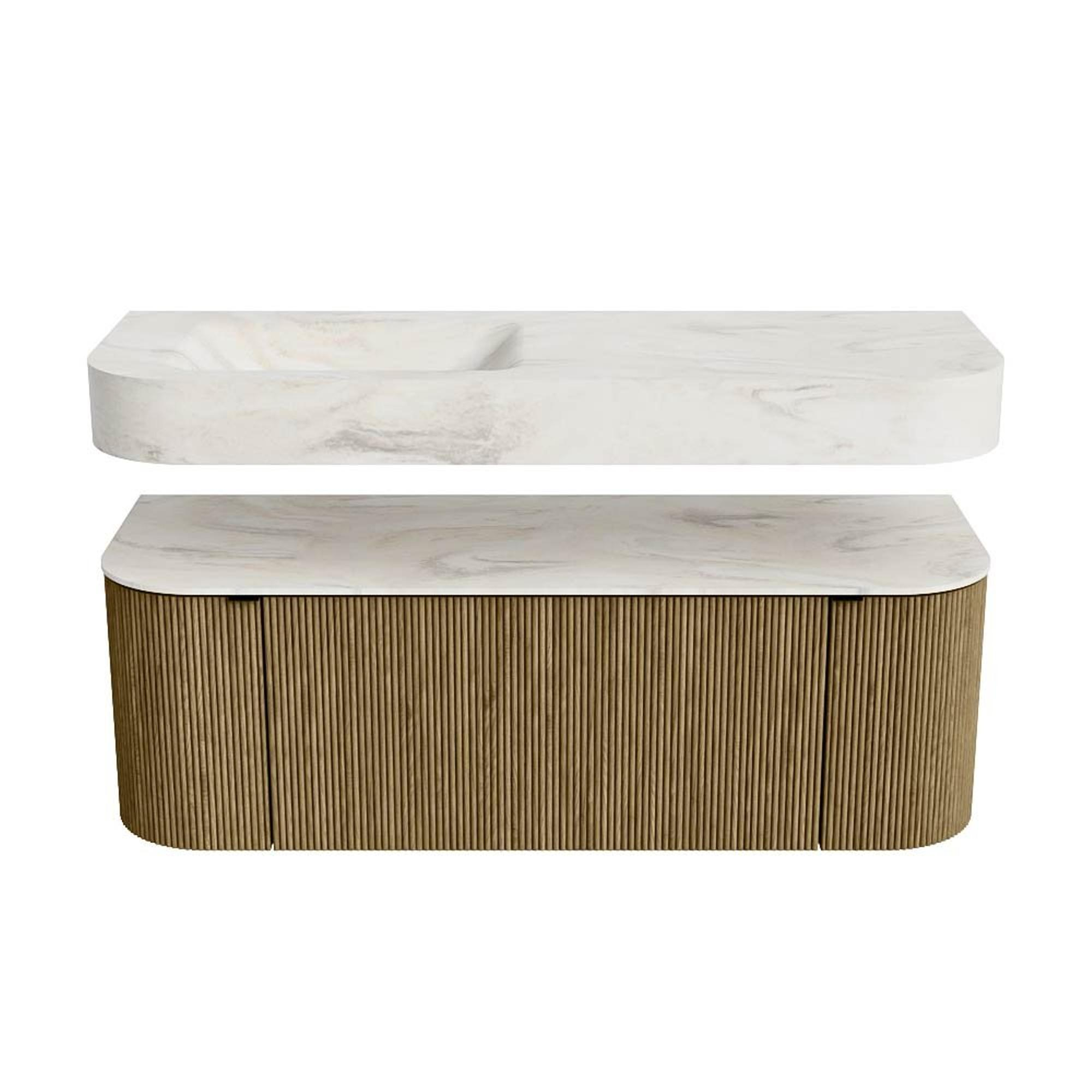 MONDIAZ THOR-DLUX 130cm badmeubel ronding links + rechts kleur Dusk met 1 lade en 2 deuren. Vrijhangende wastafel CLOUD Links zonder kraangat kleur Ostra.
