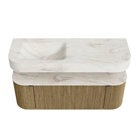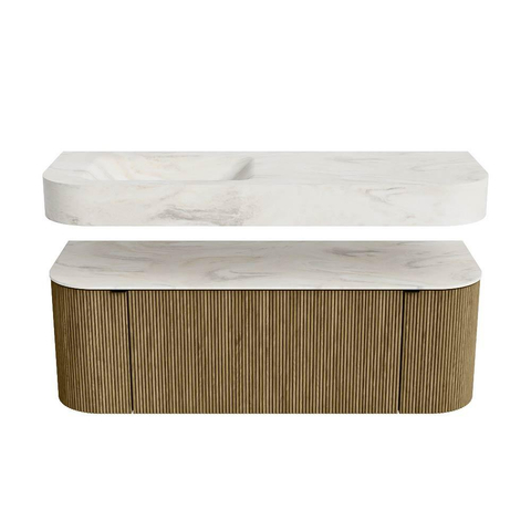 Boven het meubel zweeft een bijpassende, vrij hangende wastafel met afgeronde hoeken – perfect afgestemd op de vorm van de kast. De wastafel is uitgevoerd in Solid Surface en volgt subtiel de lijnen van het onderliggende meubel, waardoor een harmonieus geheel ontstaat. Het Solid Surface topblad vormt een sterke, onderhoudsvriendelijke basis en maakt de combinatie compleet.