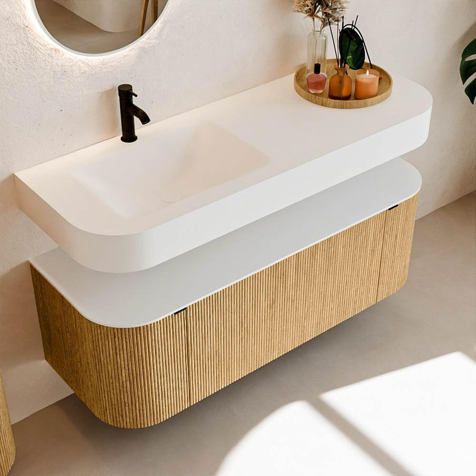 Boven het meubel zweeft een bijpassende, vrij hangende wastafel met afgeronde hoeken – perfect afgestemd op de vorm van de kast. De wastafel is uitgevoerd in Solid Surface en volgt subtiel de lijnen van het onderliggende meubel, waardoor een harmonieus geheel ontstaat. Het Solid Surface topblad vormt een sterke, onderhoudsvriendelijke basis en maakt de combinatie compleet.