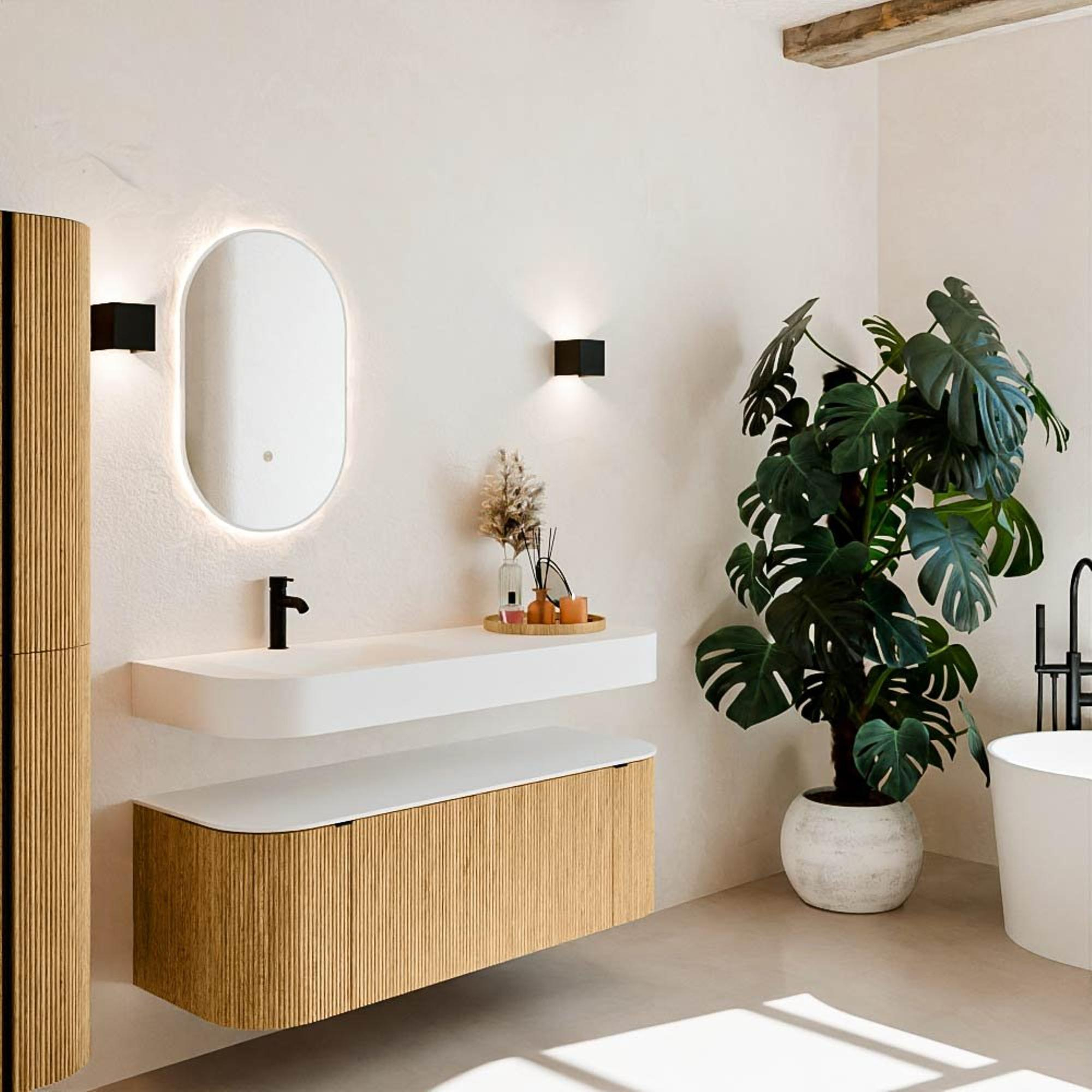 Natuurlijke materialen in warme tinten. De verticale ribbels brengen ritme en textuur in het ontwerp, terwijl het eikenhout zorgt voor een warme, ambachtelijke uitstraling. Kies uit 5 houttinten OAK, WALNUT, DUSK, SHADOW en RUBY zorgvuldig geselecteerde houtkleuren om zowel moderne als klassieke badkamers te verrijken.