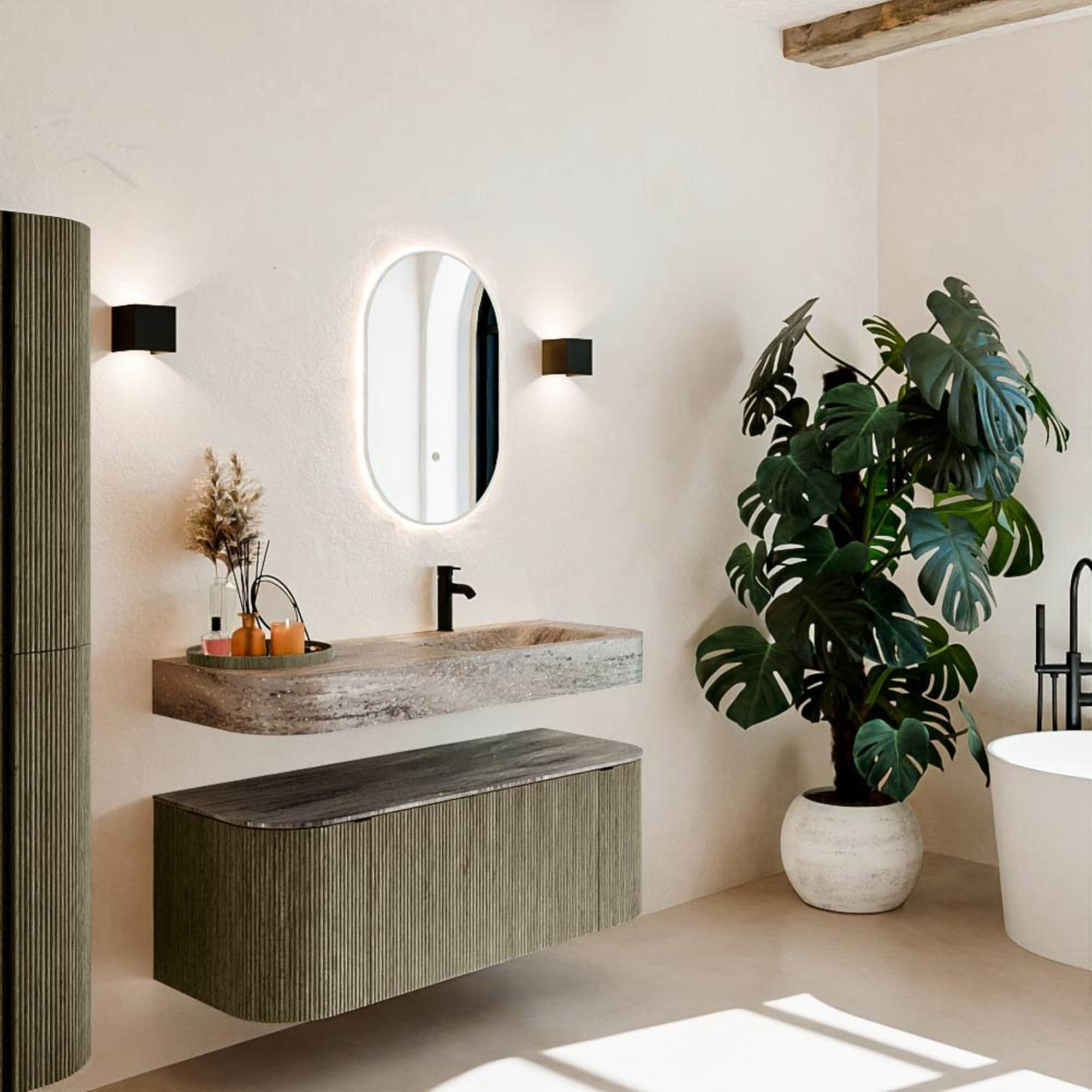 Natuurlijke materialen in warme tinten. De verticale ribbels brengen ritme en textuur in het ontwerp, terwijl het eikenhout zorgt voor een warme, ambachtelijke uitstraling. Kies uit 5 houttinten OAK, WALNUT, DUSK, SHADOW en RUBY zorgvuldig geselecteerde houtkleuren om zowel moderne als klassieke badkamers te verrijken.