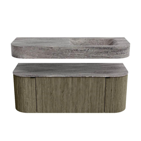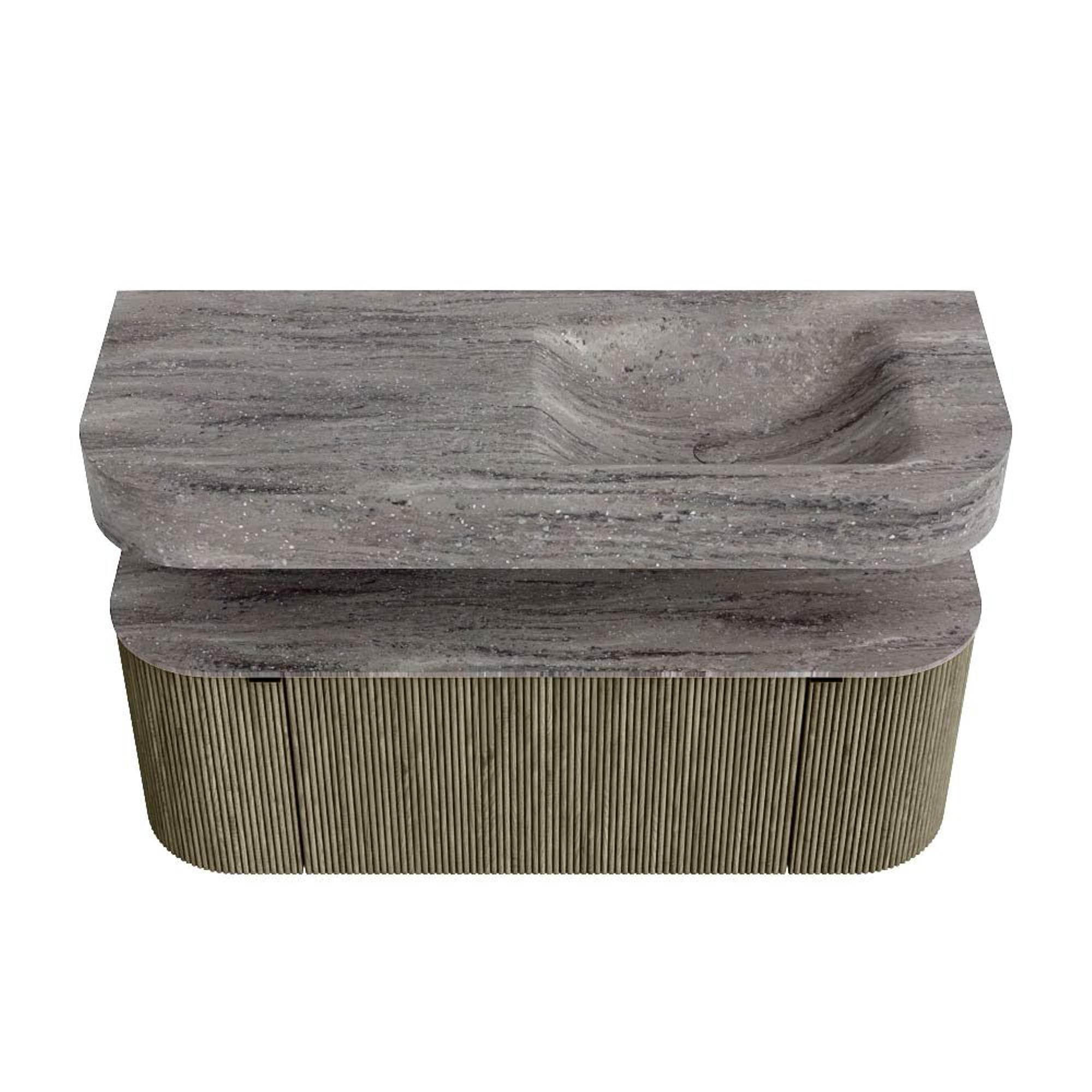 MONDIAZ THOR-DLUX 120cm badmeubel ronding links + rechts kleur Shadow met 1 lade en 2 deuren. Vrijhangende wastafel CLOUD Rechts 1 kraangat kleur Oza.