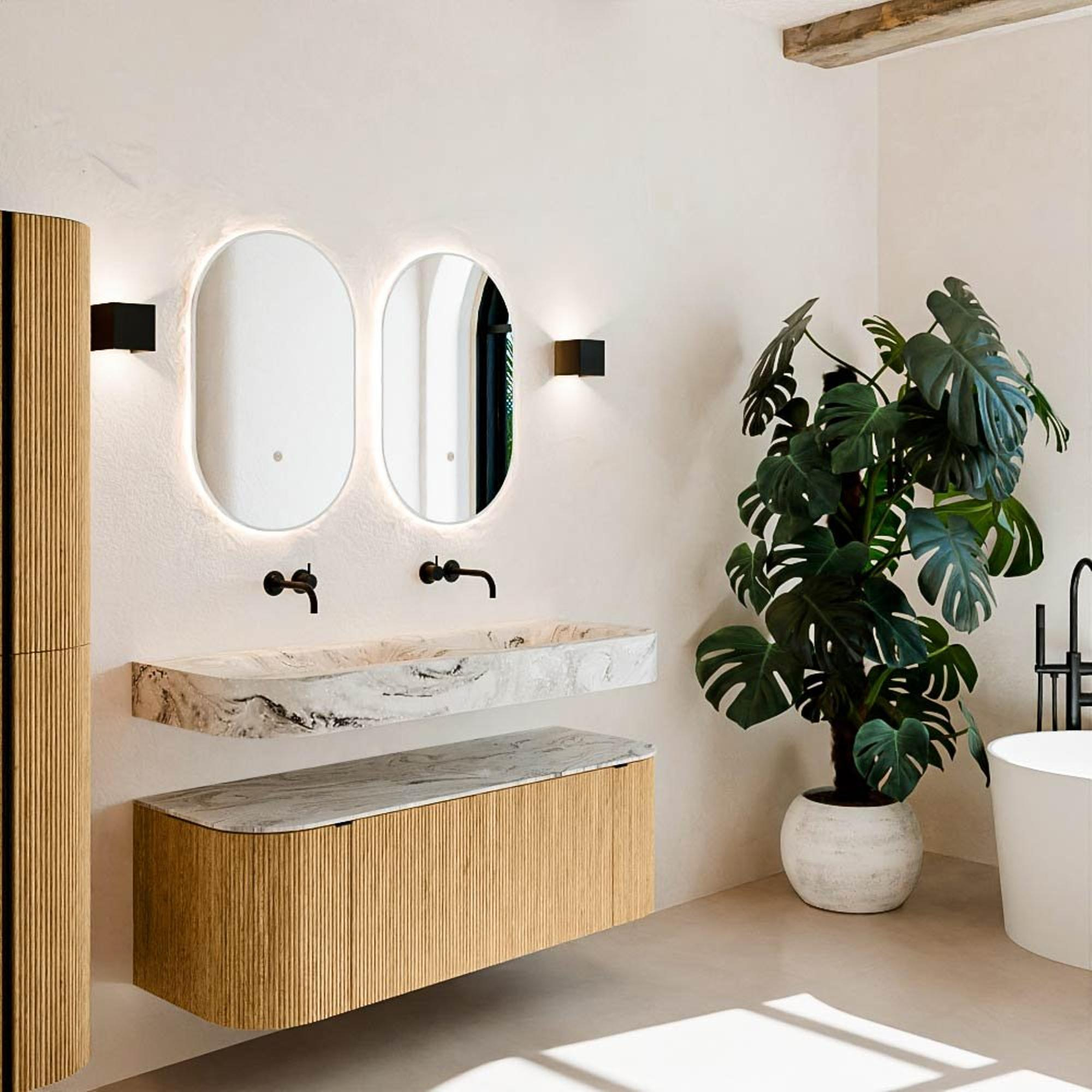 Natuurlijke materialen in warme tinten. De verticale ribbels brengen ritme en textuur in het ontwerp, terwijl het eikenhout zorgt voor een warme, ambachtelijke uitstraling. Kies uit 5 houttinten OAK, WALNUT, DUSK, SHADOW en RUBY zorgvuldig geselecteerde houtkleuren om zowel moderne als klassieke badkamers te verrijken.