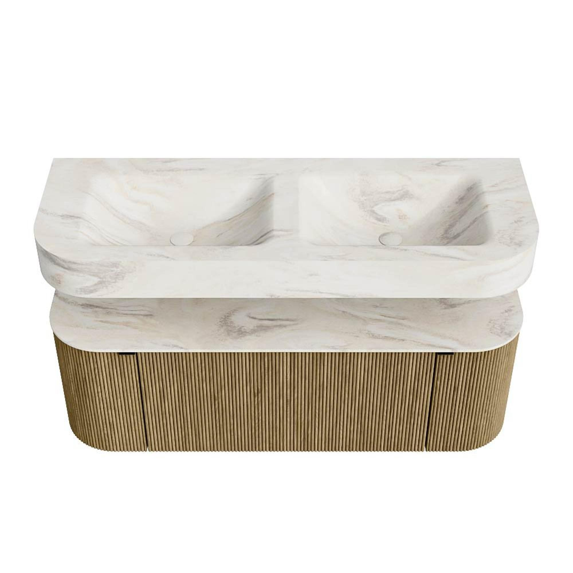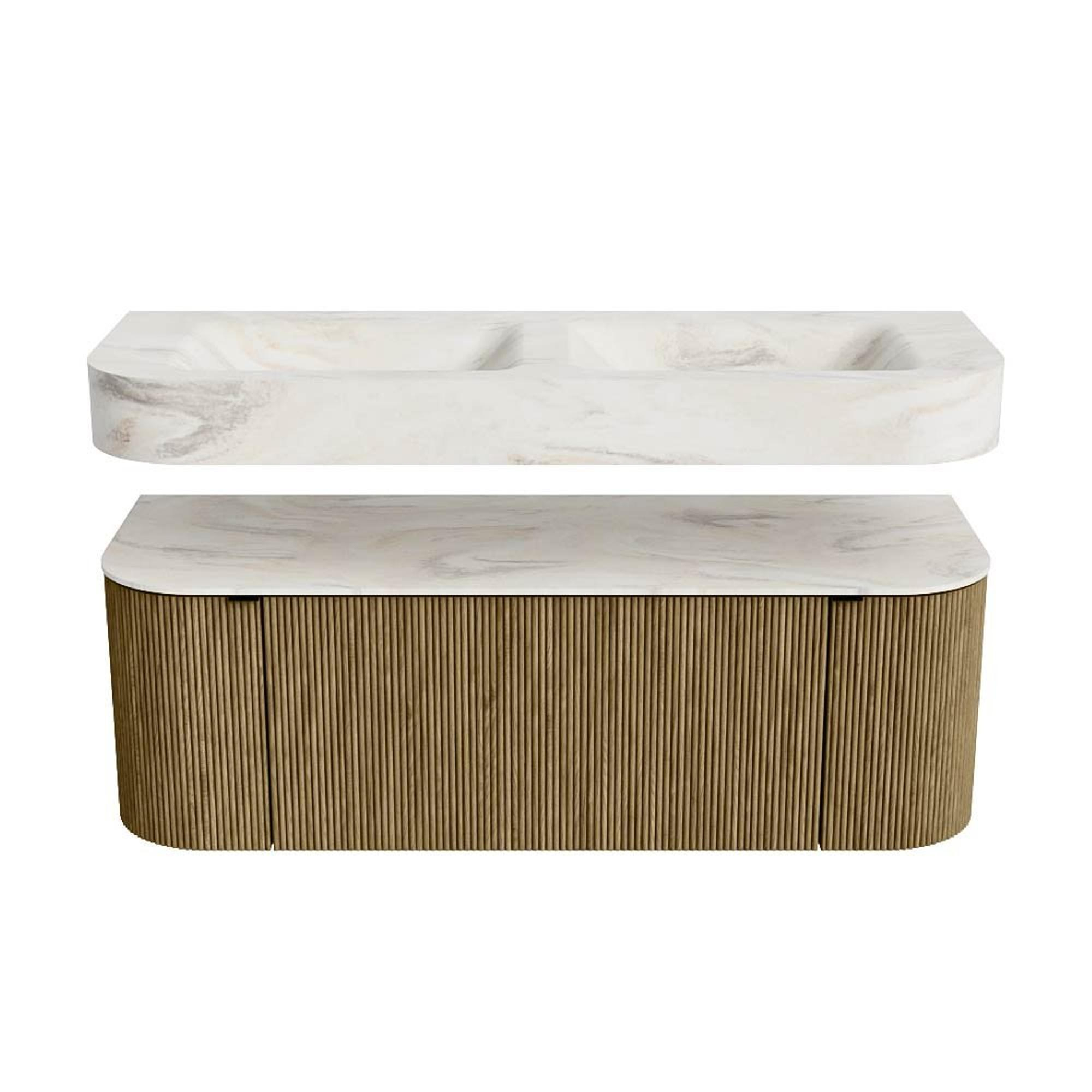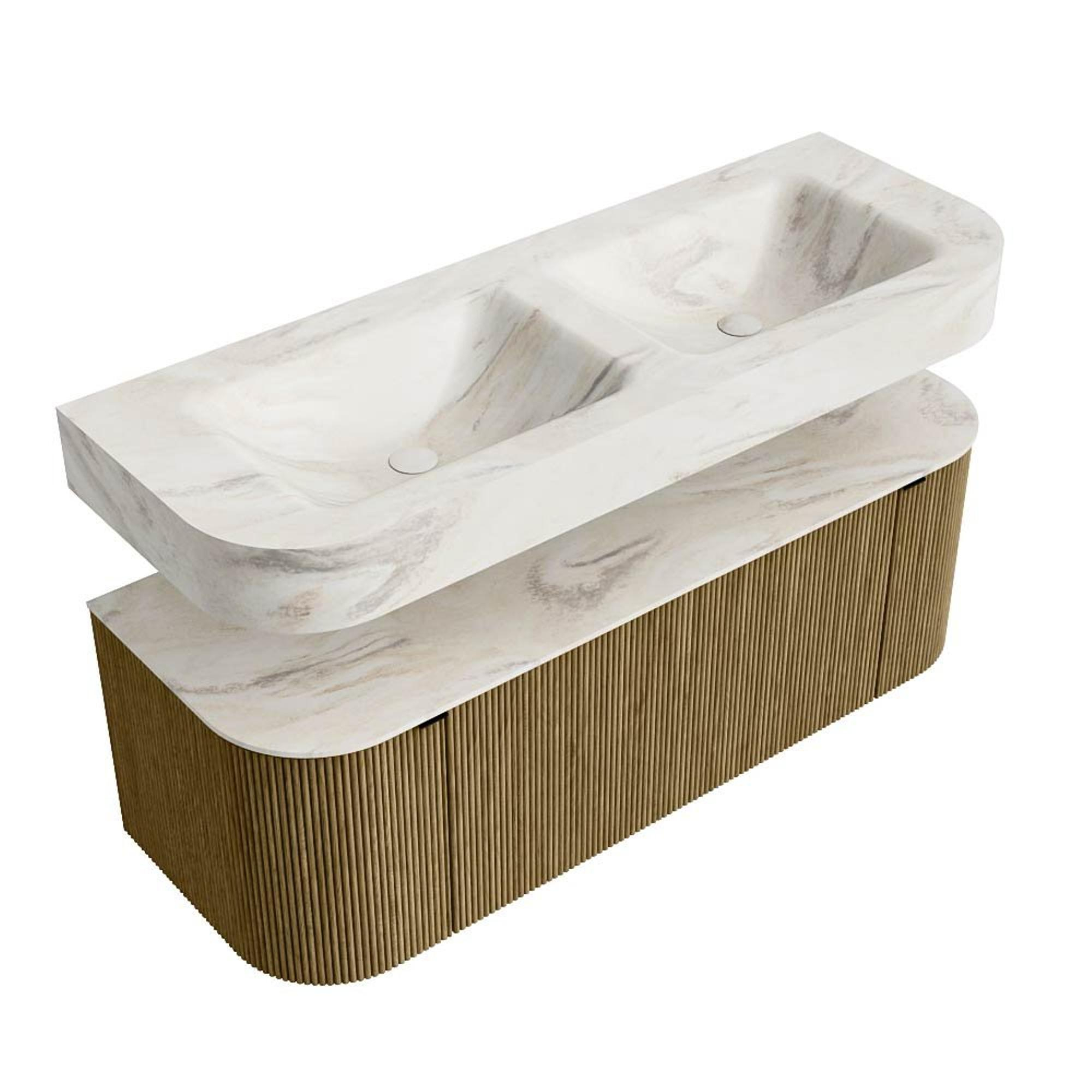 MONDIAZ THOR-DLUX 130cm badmeubel ronding links + rechts kleur Dusk met 1 lade en 2 deuren. Vrijhangende wastafel CLOUD Dubbel zonder kraangat kleur Ostra.