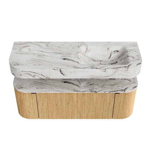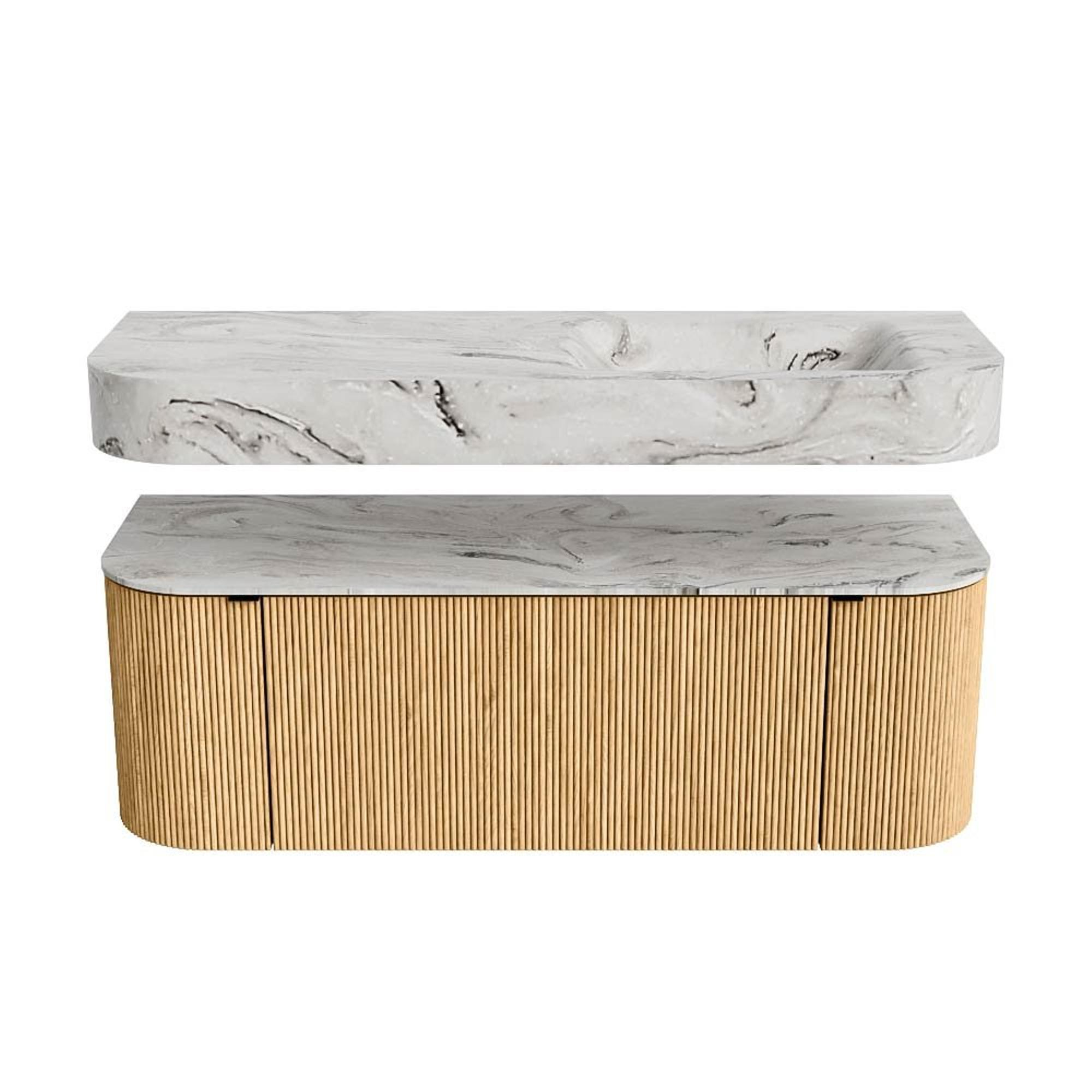 MONDIAZ THOR-DLUX 130cm badmeubel ronding links + rechts kleur Oak met 1 lade en 2 deuren. Vrijhangende wastafel CLOUD Rechts 1 kraangat kleur Glace.