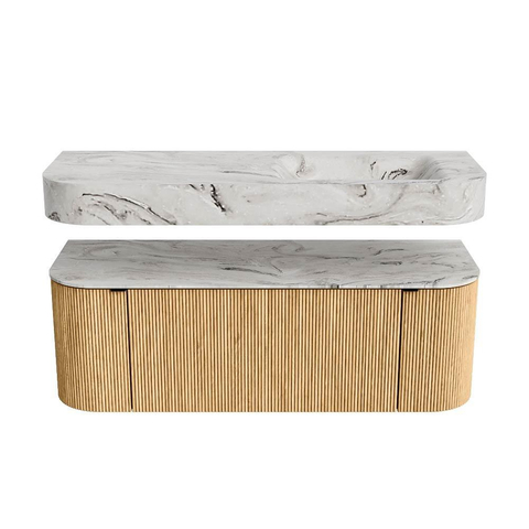 Boven het meubel zweeft een bijpassende, vrij hangende wastafel met afgeronde hoeken – perfect afgestemd op de vorm van de kast. De wastafel is uitgevoerd in Solid Surface en volgt subtiel de lijnen van het onderliggende meubel, waardoor een harmonieus geheel ontstaat. Het Solid Surface topblad vormt een sterke, onderhoudsvriendelijke basis en maakt de combinatie compleet.
