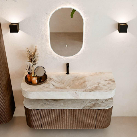 MONDIAZ THOR-DLUX 130cm badmeubel ronding links + rechts kleur Walnut met 1 lade en 2 deuren. Vrijhangende wastafel CLOUD Midden 1 kraangat kleur Frappe.