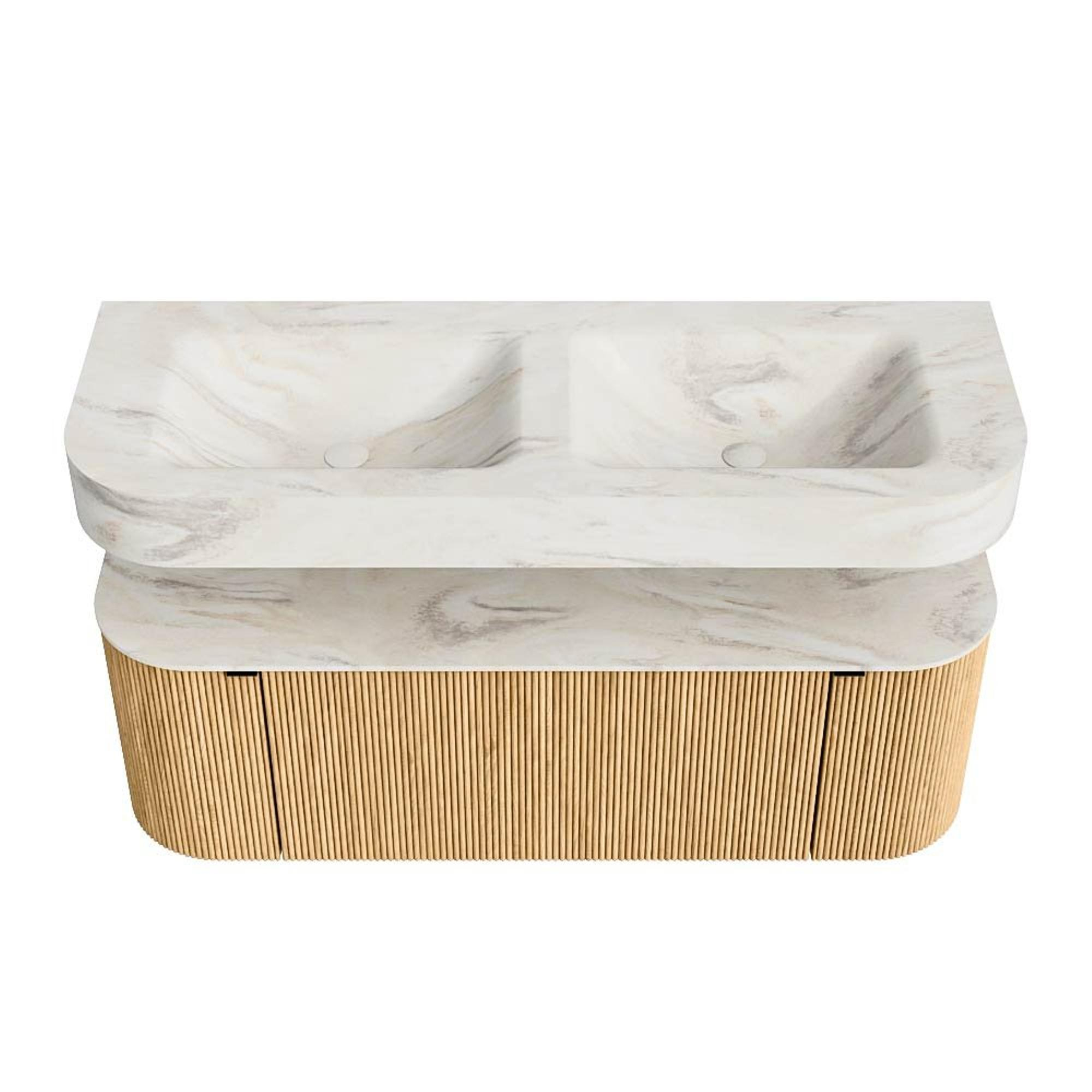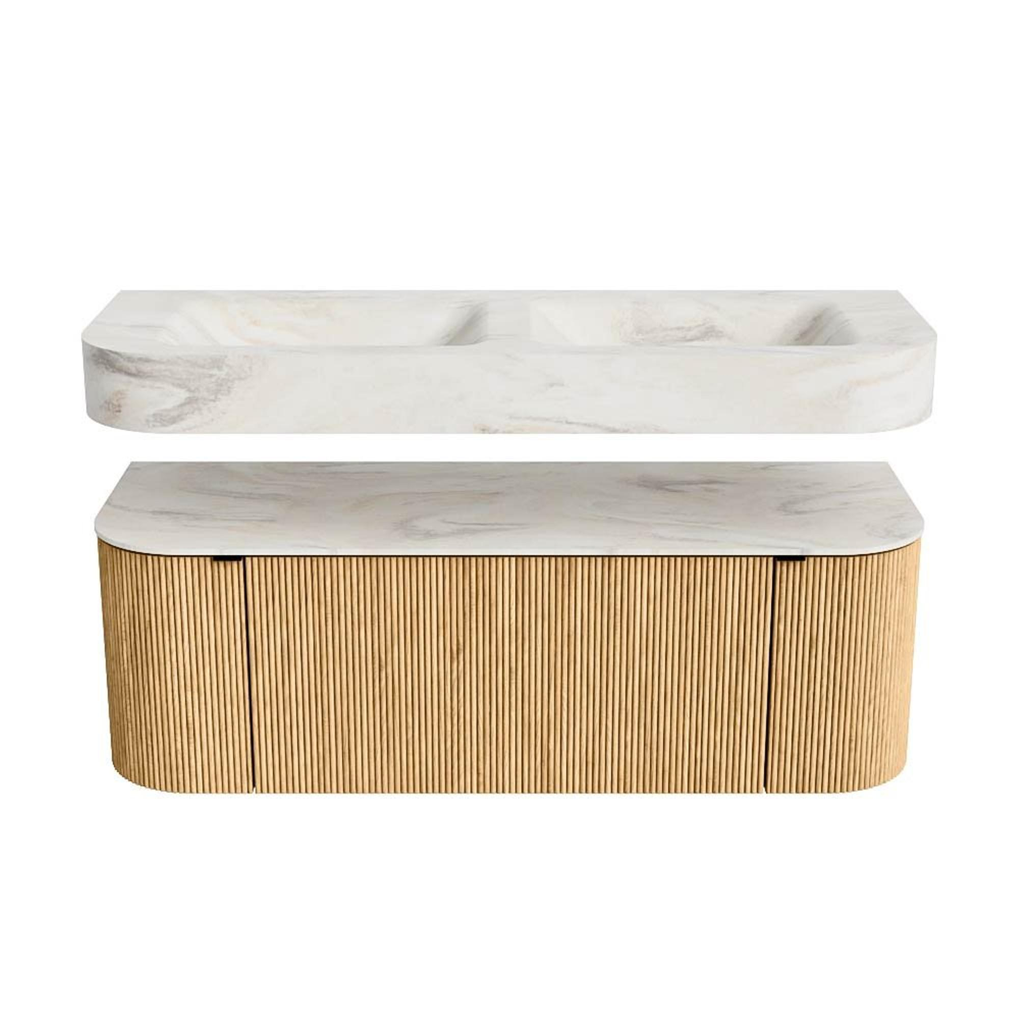 MONDIAZ THOR-DLUX 130cm badmeubel ronding links + rechts kleur Oak met 1 lade en 2 deuren. Vrijhangende wastafel CLOUD Dubbel zonder kraangat kleur Ostra.