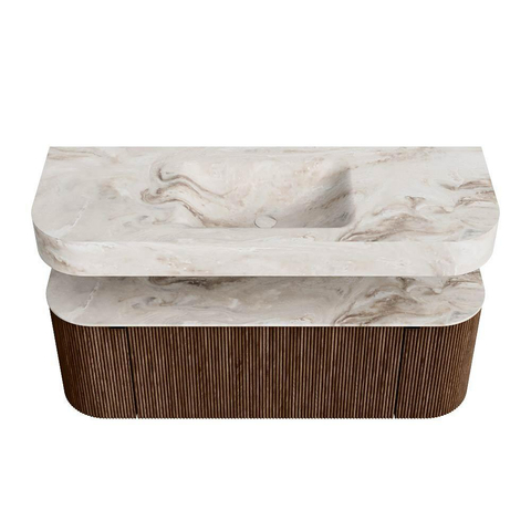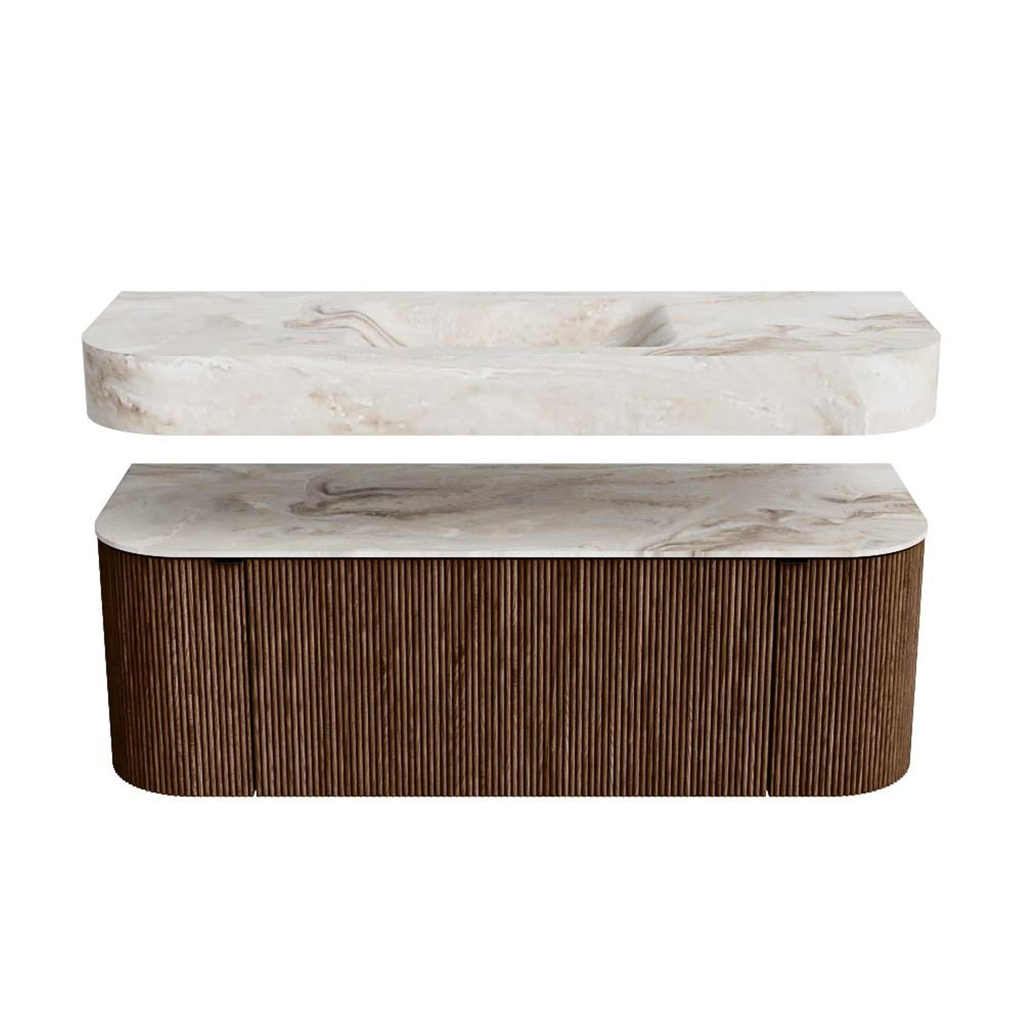 MONDIAZ THOR-DLUX 130cm badmeubel ronding links + rechts kleur Walnut met 1 lade en 2 deuren. Vrijhangende wastafel CLOUD Midden zonder kraangat kleur Frappe.