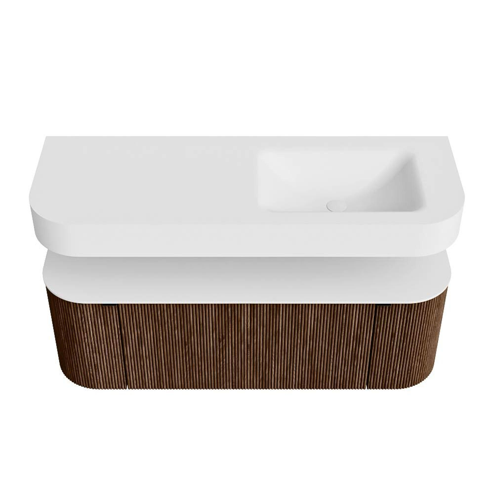 Boven het meubel zweeft een bijpassende, vrij hangende wastafel met afgeronde hoeken – perfect afgestemd op de vorm van de kast. De wastafel is uitgevoerd in Solid Surface en volgt subtiel de lijnen van het onderliggende meubel, waardoor een harmonieus geheel ontstaat. Het Solid Surface topblad vormt een sterke, onderhoudsvriendelijke basis en maakt de combinatie compleet.