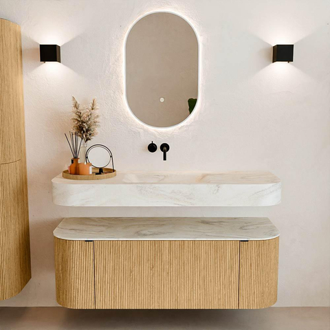 Boven het meubel zweeft een bijpassende, vrij hangende wastafel met afgeronde hoeken – perfect afgestemd op de vorm van de kast. De wastafel is uitgevoerd in Solid Surface en volgt subtiel de lijnen van het onderliggende meubel, waardoor een harmonieus geheel ontstaat. Het Solid Surface topblad vormt een sterke, onderhoudsvriendelijke basis en maakt de combinatie compleet.