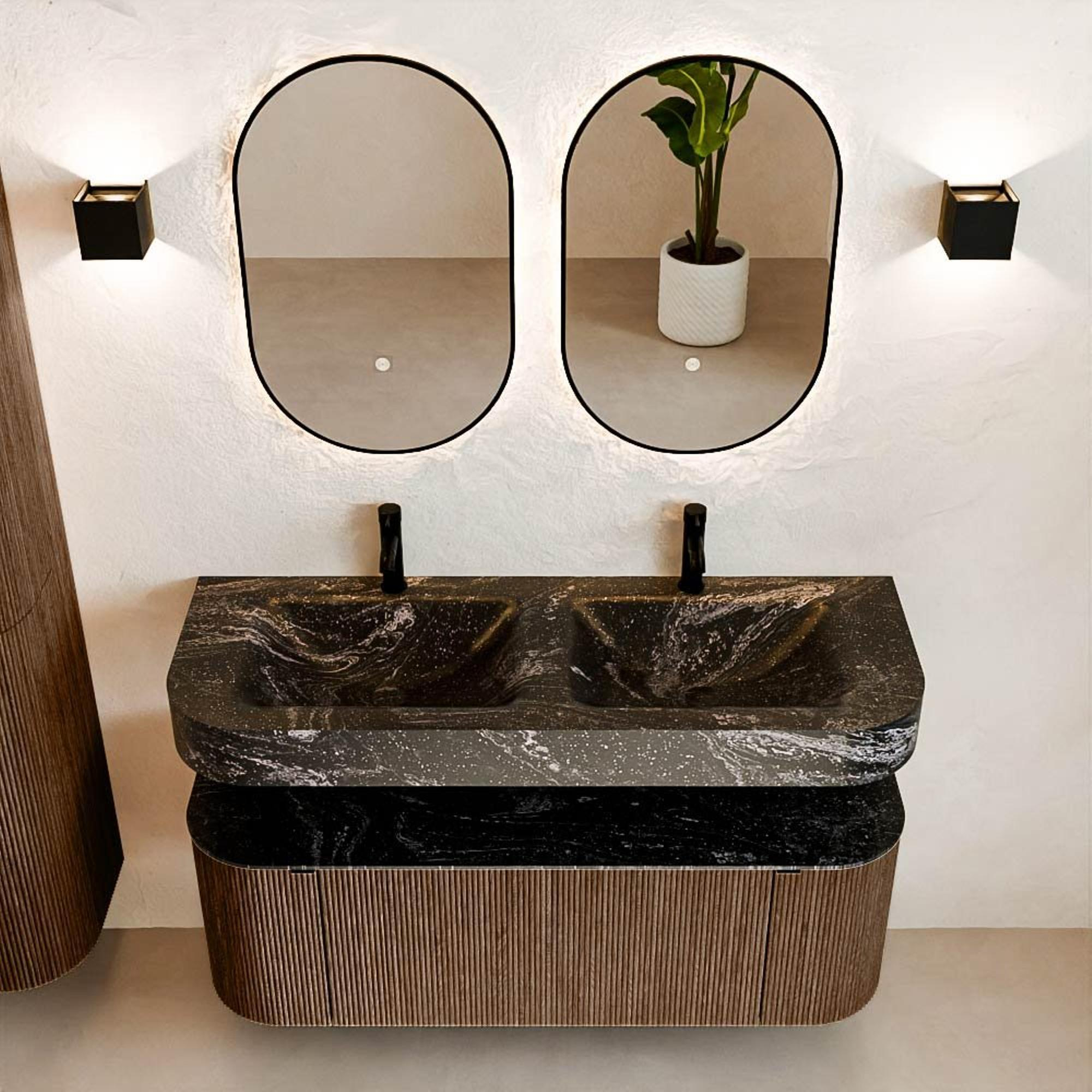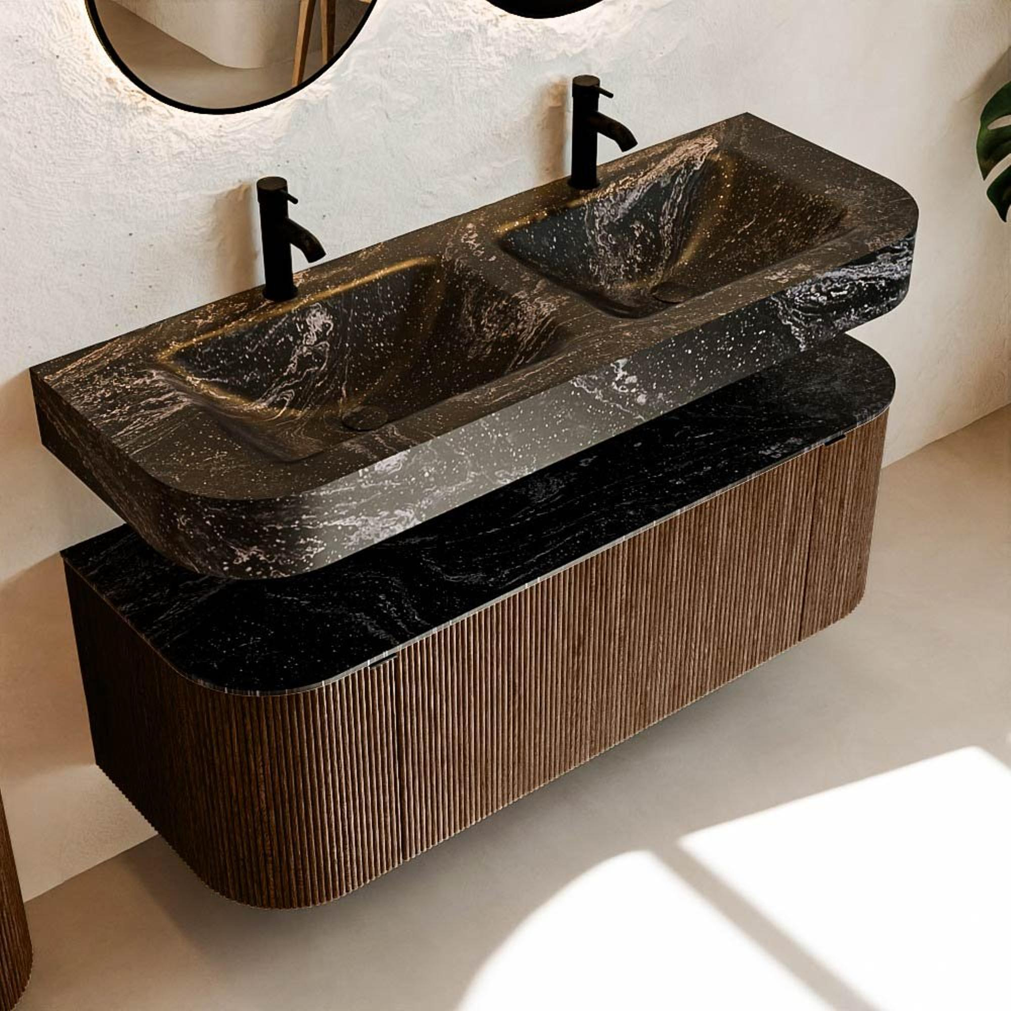 MONDIAZ THOR-DLUX 130cm badmeubel ronding links + rechts kleur Walnut met 1 lade en 2 deuren. Vrijhangende wastafel CLOUD Dubbel 2 kraangaten kleur Lava.