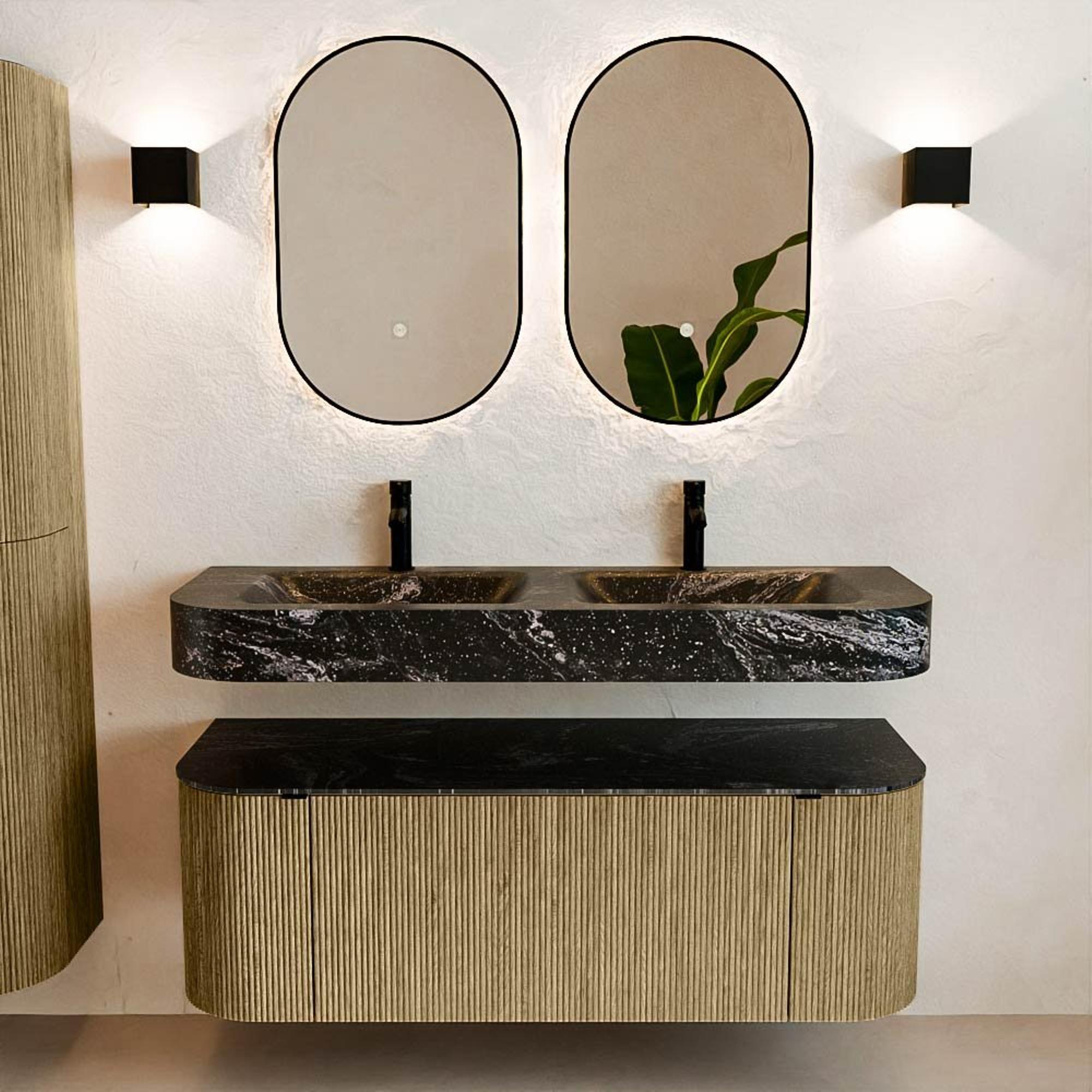 Natuurlijke materialen in warme tinten. De verticale ribbels brengen ritme en textuur in het ontwerp, terwijl het eikenhout zorgt voor een warme, ambachtelijke uitstraling. Kies uit 5 houttinten OAK, WALNUT, DUSK, SHADOW en RUBY zorgvuldig geselecteerde houtkleuren om zowel moderne als klassieke badkamers te verrijken.