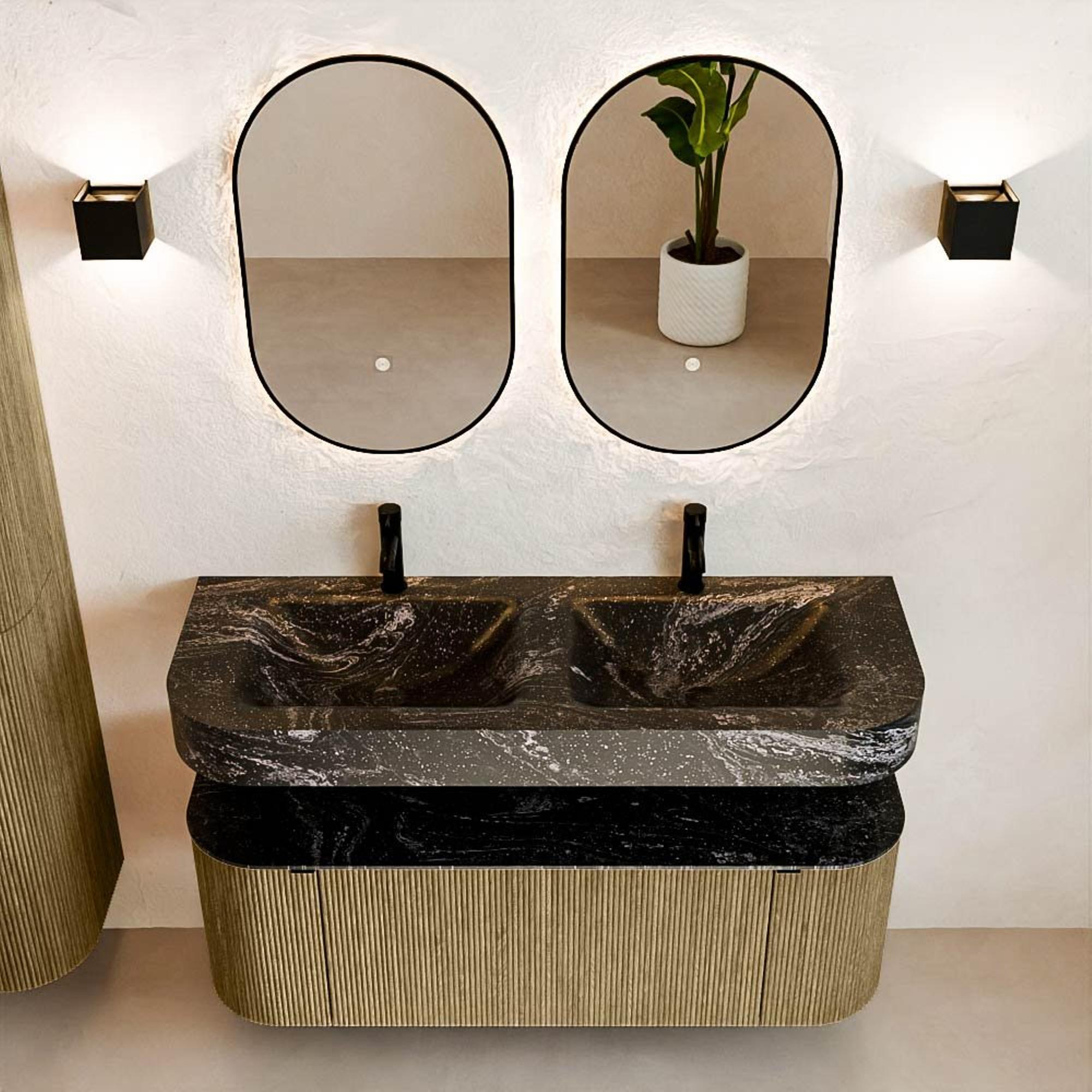 MONDIAZ THOR-DLUX 130cm badmeubel ronding links + rechts kleur Dusk met 1 lade en 2 deuren. Vrijhangende wastafel CLOUD Dubbel 2 kraangaten kleur Lava.