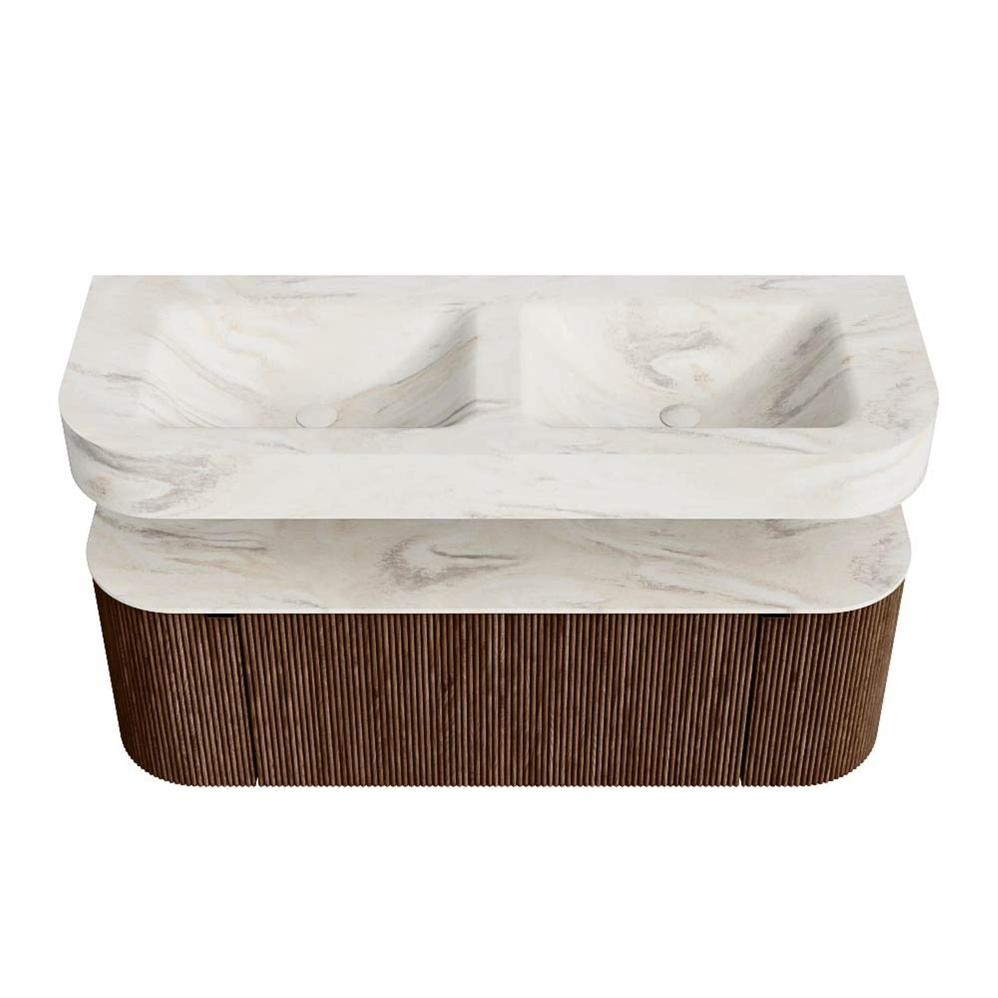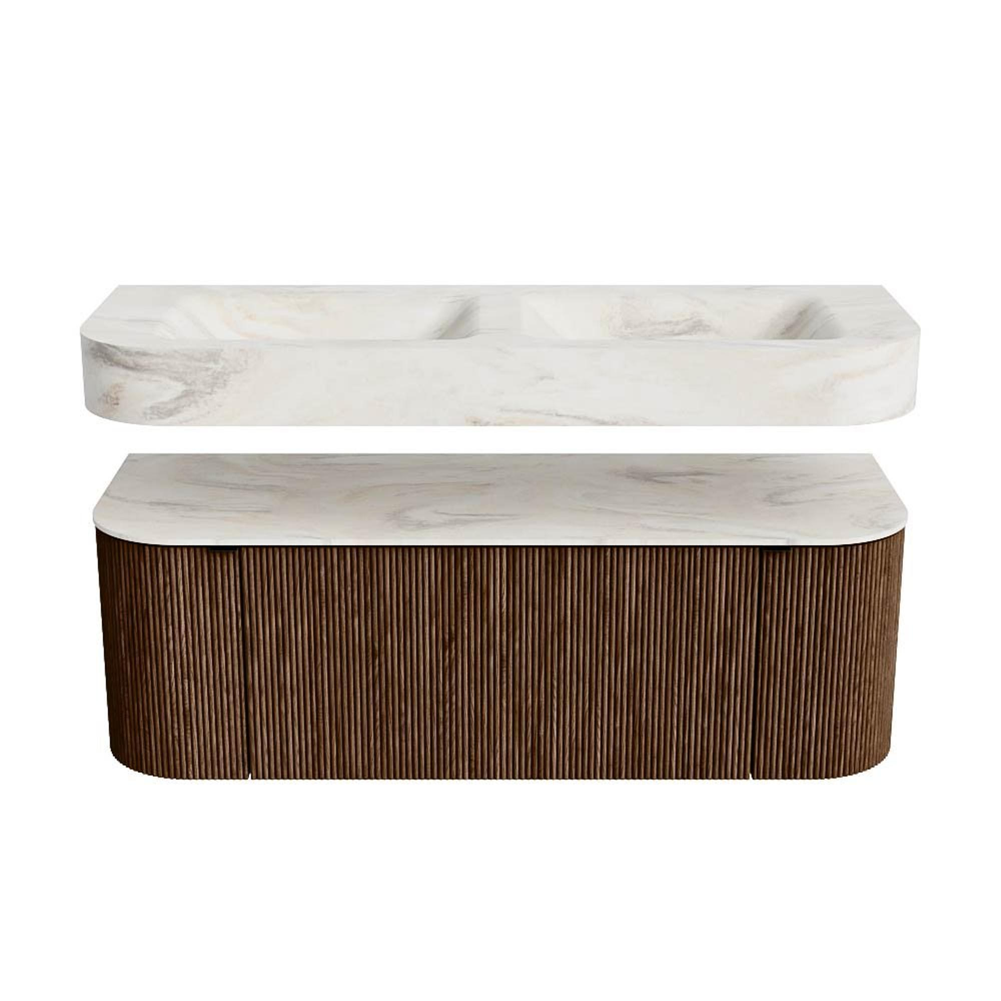 MONDIAZ THOR-DLUX 130cm badmeubel ronding links + rechts kleur Walnut met 1 lade en 2 deuren. Vrijhangende wastafel CLOUD Dubbel zonder kraangat kleur Ostra.