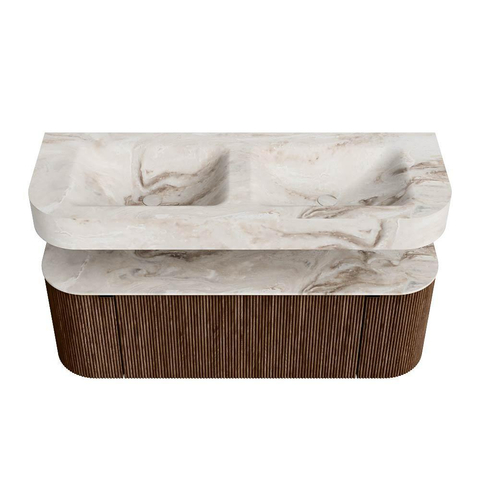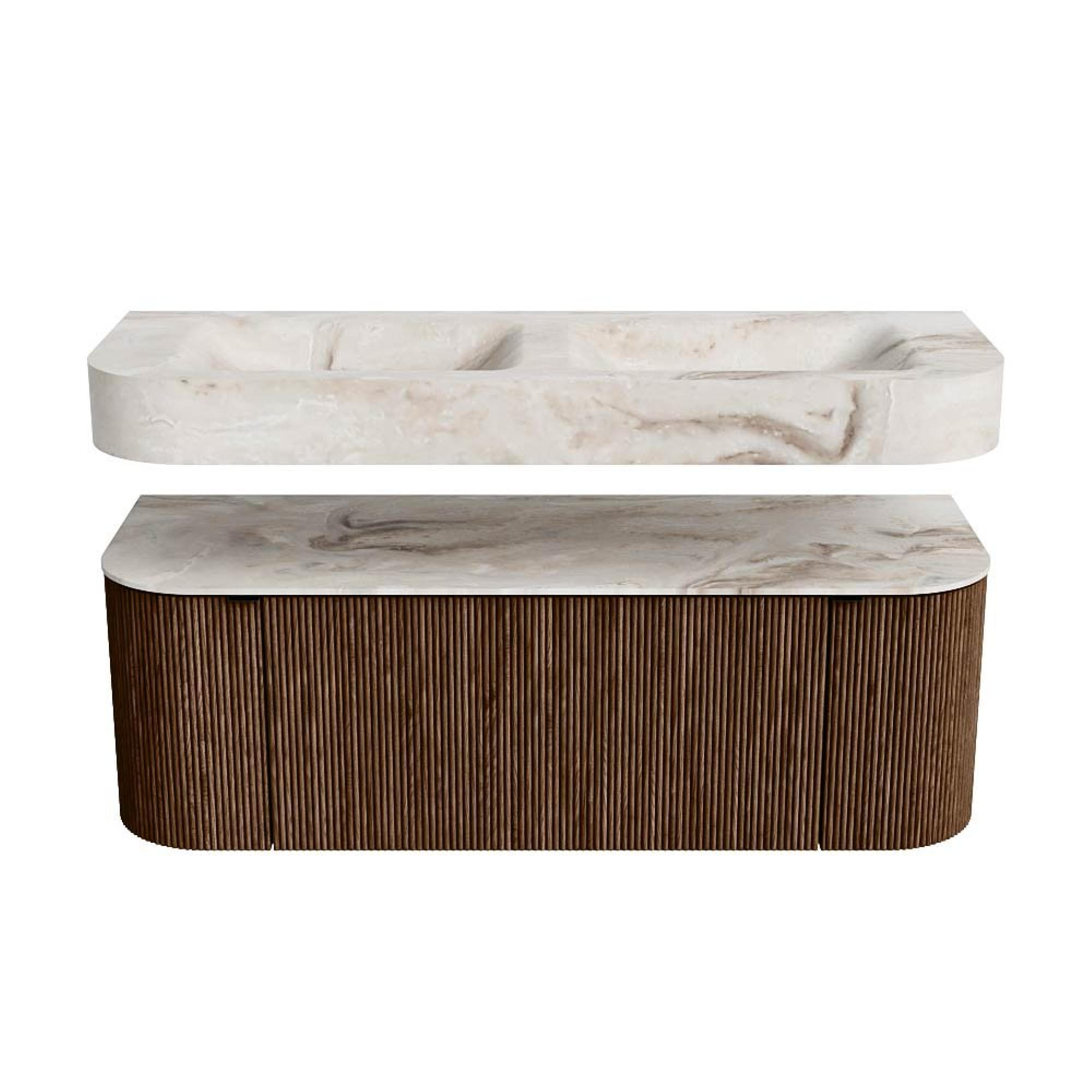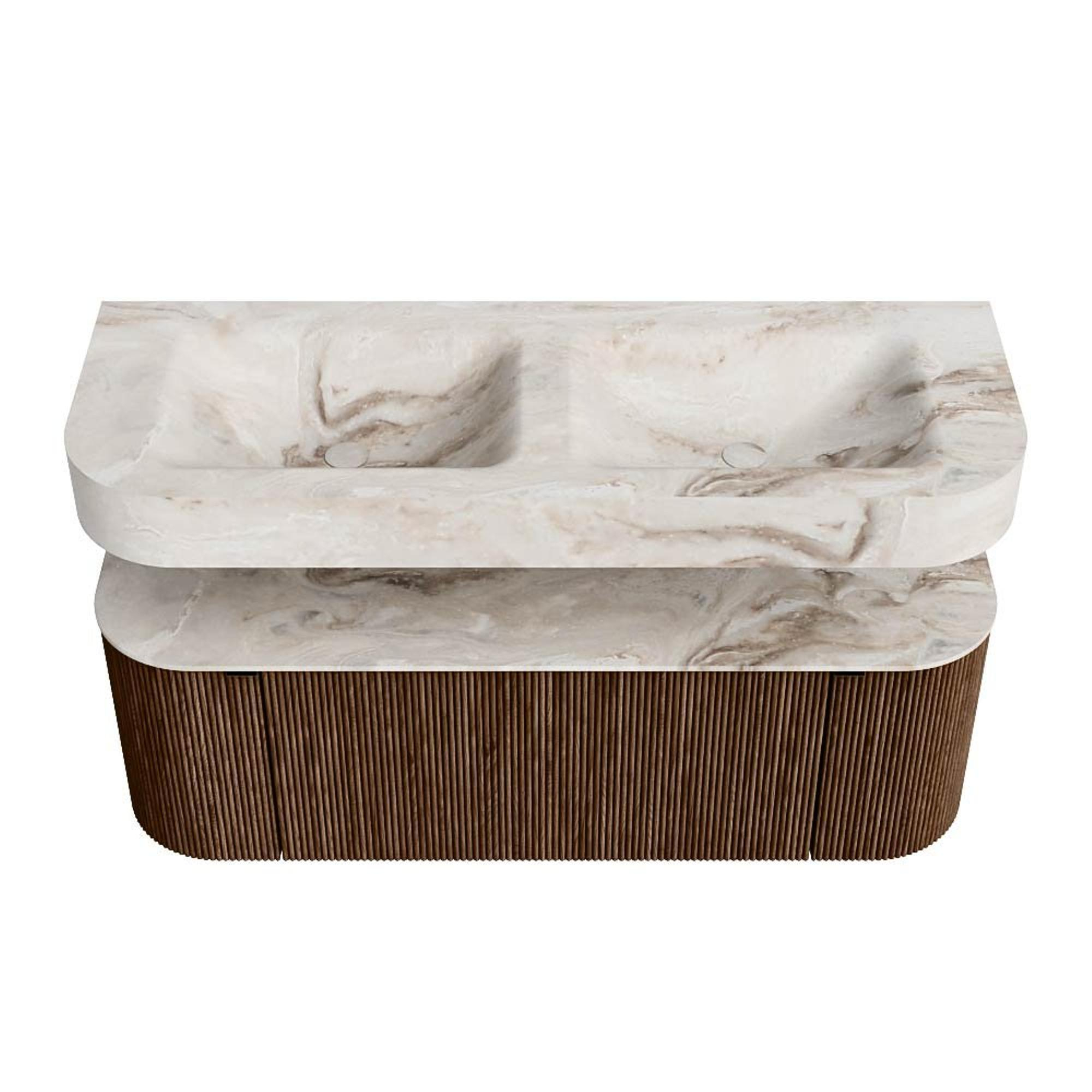 MONDIAZ THOR-DLUX 130cm badmeubel ronding links + rechts kleur Walnut met 1 lade en 2 deuren. Vrijhangende wastafel CLOUD Dubbel zonder kraangat kleur Frappe.