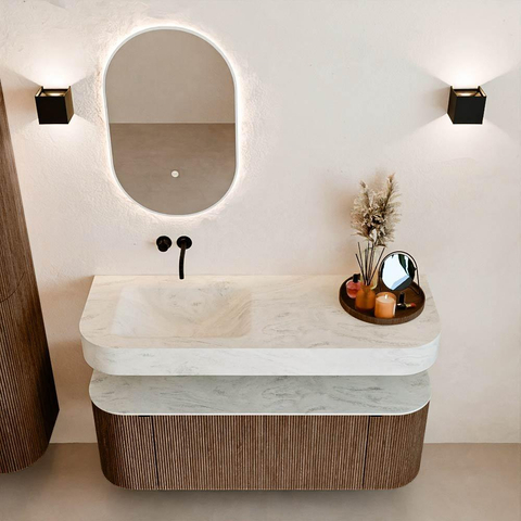 MONDIAZ THOR-DLUX 130cm badmeubel ronding links + rechts kleur Walnut met 1 lade en 2 deuren. Vrijhangende wastafel CLOUD Links zonder kraangat kleur Opalo.