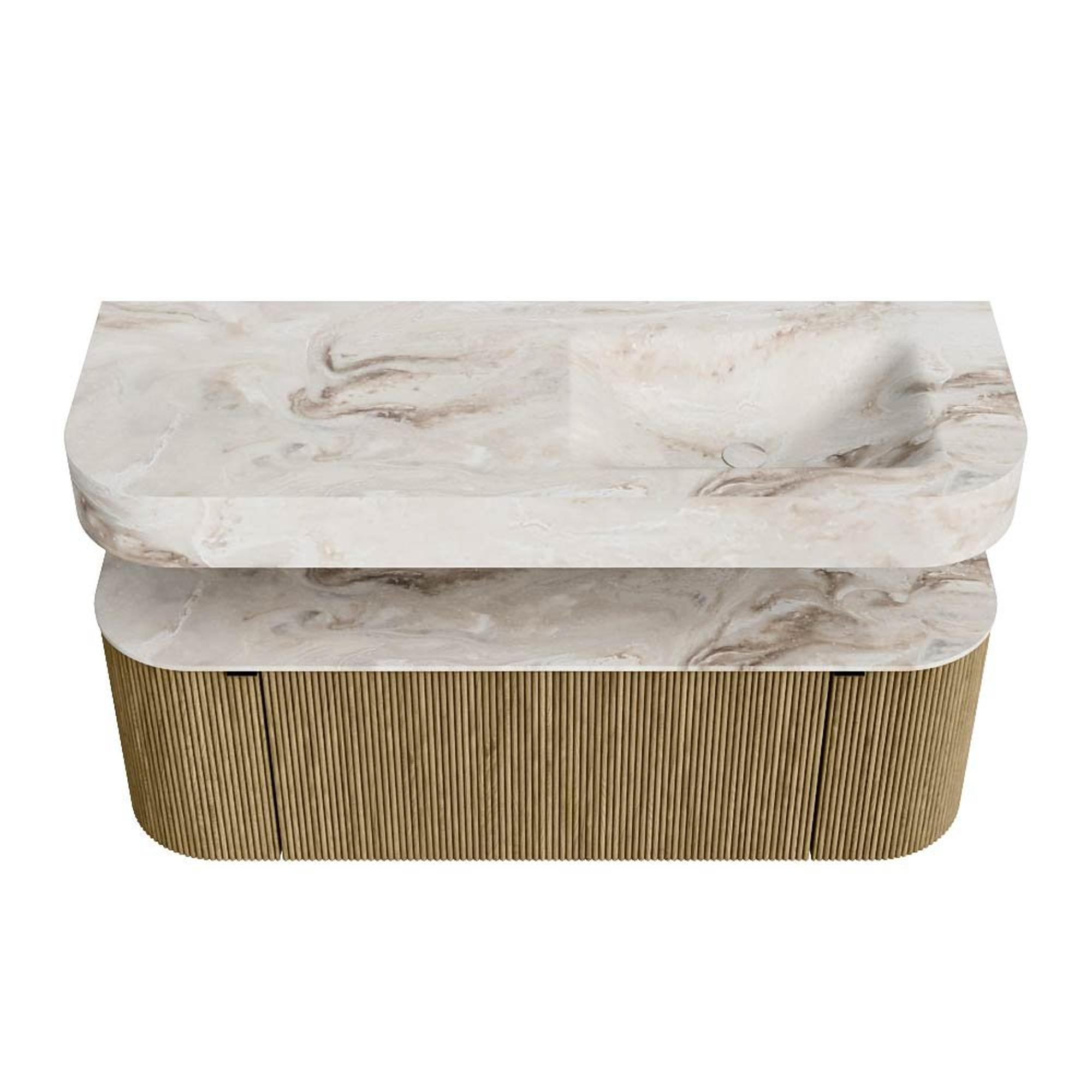 MONDIAZ THOR-DLUX 130cm badmeubel ronding links + rechts kleur Dusk met 1 lade en 2 deuren. Vrijhangende wastafel CLOUD Rechts 1 kraangat kleur Frappe.