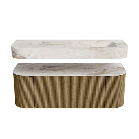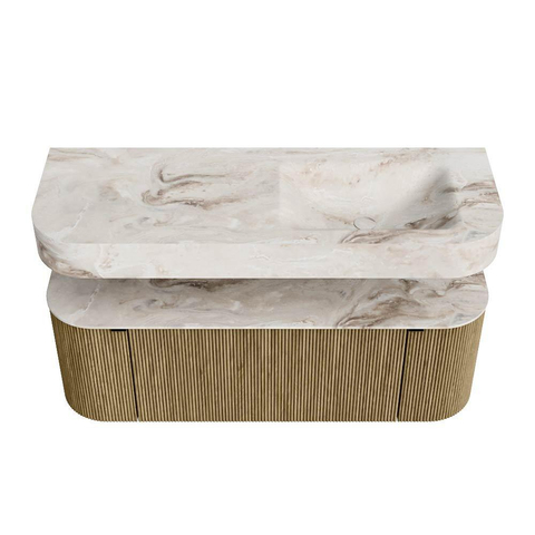 Boven het meubel zweeft een bijpassende, vrij hangende wastafel met afgeronde hoeken – perfect afgestemd op de vorm van de kast. De wastafel is uitgevoerd in Solid Surface en volgt subtiel de lijnen van het onderliggende meubel, waardoor een harmonieus geheel ontstaat. Het Solid Surface topblad vormt een sterke, onderhoudsvriendelijke basis en maakt de combinatie compleet.