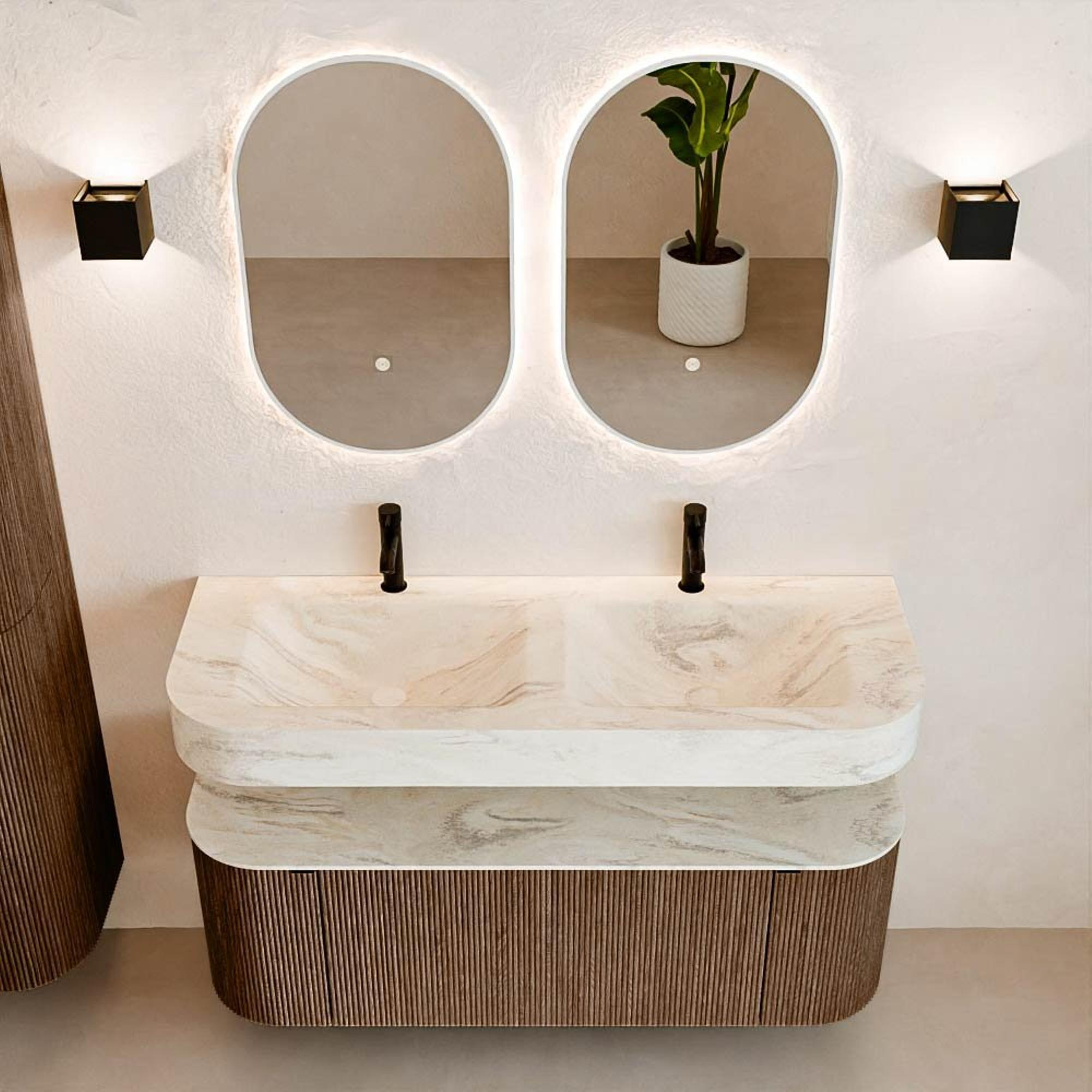 MONDIAZ THOR-DLUX 130cm badmeubel ronding links + rechts kleur Walnut met 1 lade en 2 deuren. Vrijhangende wastafel CLOUD Dubbel 2 kraangaten kleur Ostra.